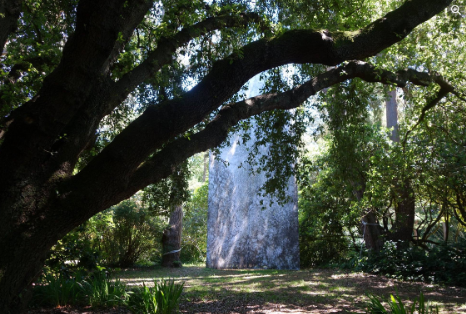 2016年《後植民計畫》赴法展出,洪天宇特別為此展繪製新作〈天水瀑布〉,以高解析度PVC microperforé材質輸出,置放於穆提耶花園(Le Bois de Moutiers)多年前被植物獵人遠渡重洋移栽的臺灣石楠後方。(圖片提供: 陳泓易)