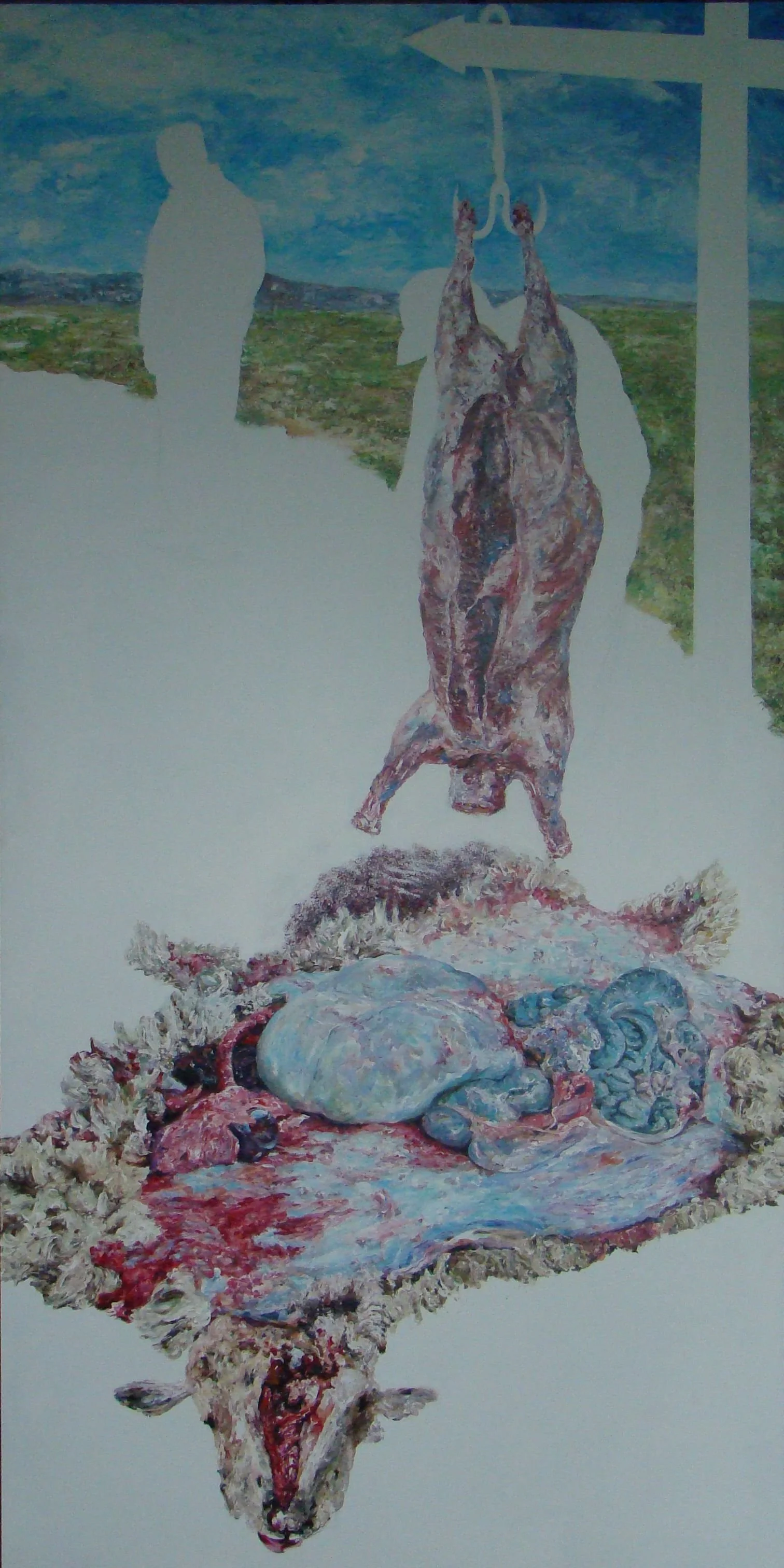 有別於古典藝術中的「食人」奇觀對人類動物性(animality)其宗教罪衍的因果觀,當代藝術更著墨於控訴以理性爲名的資本主義其不仁與宰制對生命的戕害。透過科學實驗與精密分工,資本主義讓動物屈從在計算之下以生產最大效益。