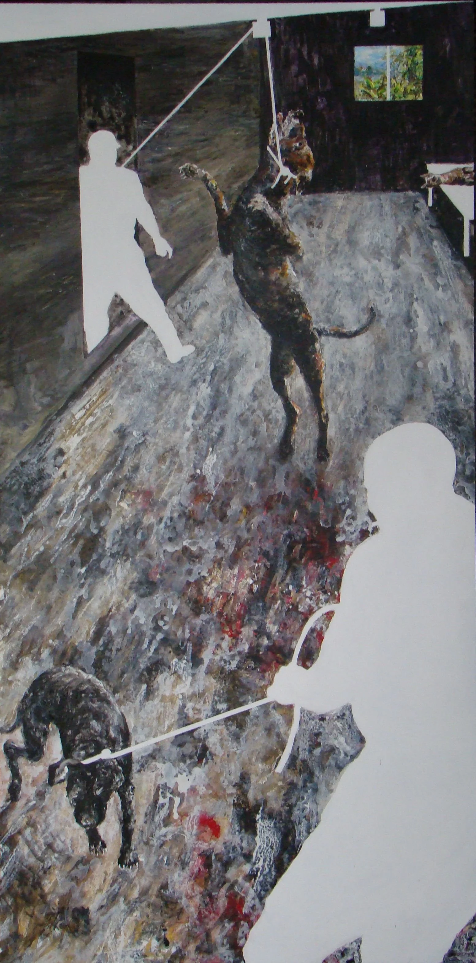 在一篇名爲〈藝術,殘酷的練習〉的文章中,巴岱耶10做了以下申明:「我付予人非人的形象。這篇章附有基督教殉教畫作、公開處決情景的插圖,就像其中大衛(Gerard David)所畫的剝皮圖。」巴岱耶賦予人非人的形象並非意指行動或停留於這些圖像的視覺呈現上。其所指乃是賦予精神的再現、觀念的引介;源自於其宗教理論中所闡述的神聖與犧牲理論。若我們將將巴岱耶的申言置諸於洪天宇的肉攤旁,則一如巴岱耶將申言置諸於攝影照片之前一般,唯有將視覺對象視為非人,方可以令人忍受。這些恐怖的影像拒絕承認那些(從藝術或其他地方)可能找出的、慘無人道的影像中的人是個人,而其所對抗的就是泯滅人性的畫面。