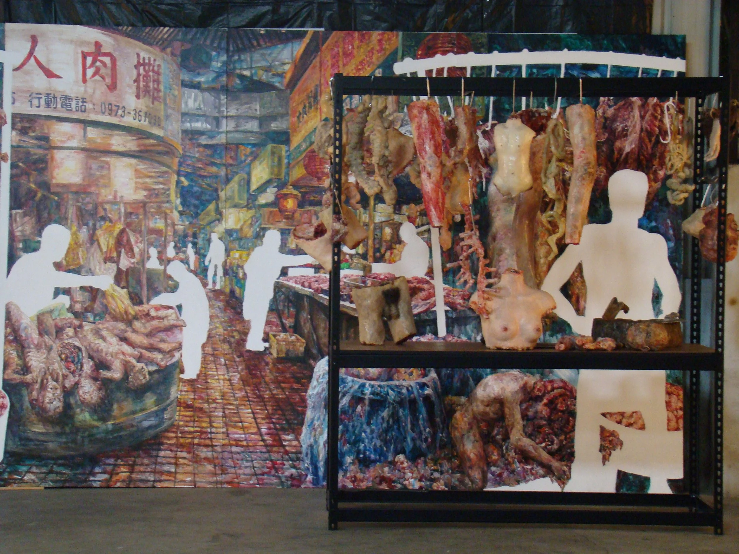 洪天宇的肢解作品,強迫觀者去接受一個人認真地殘害另一個人的殘酷,從而整個肉攤所呈現的就是人類毫無人性的一面,這個肉攤之所以令人無法忍受,並不在於肉攤上那些肢解成肉品的斷肢,而是這個肉攤涉及了眾生的疼痛與莫以言語的苦悲。
