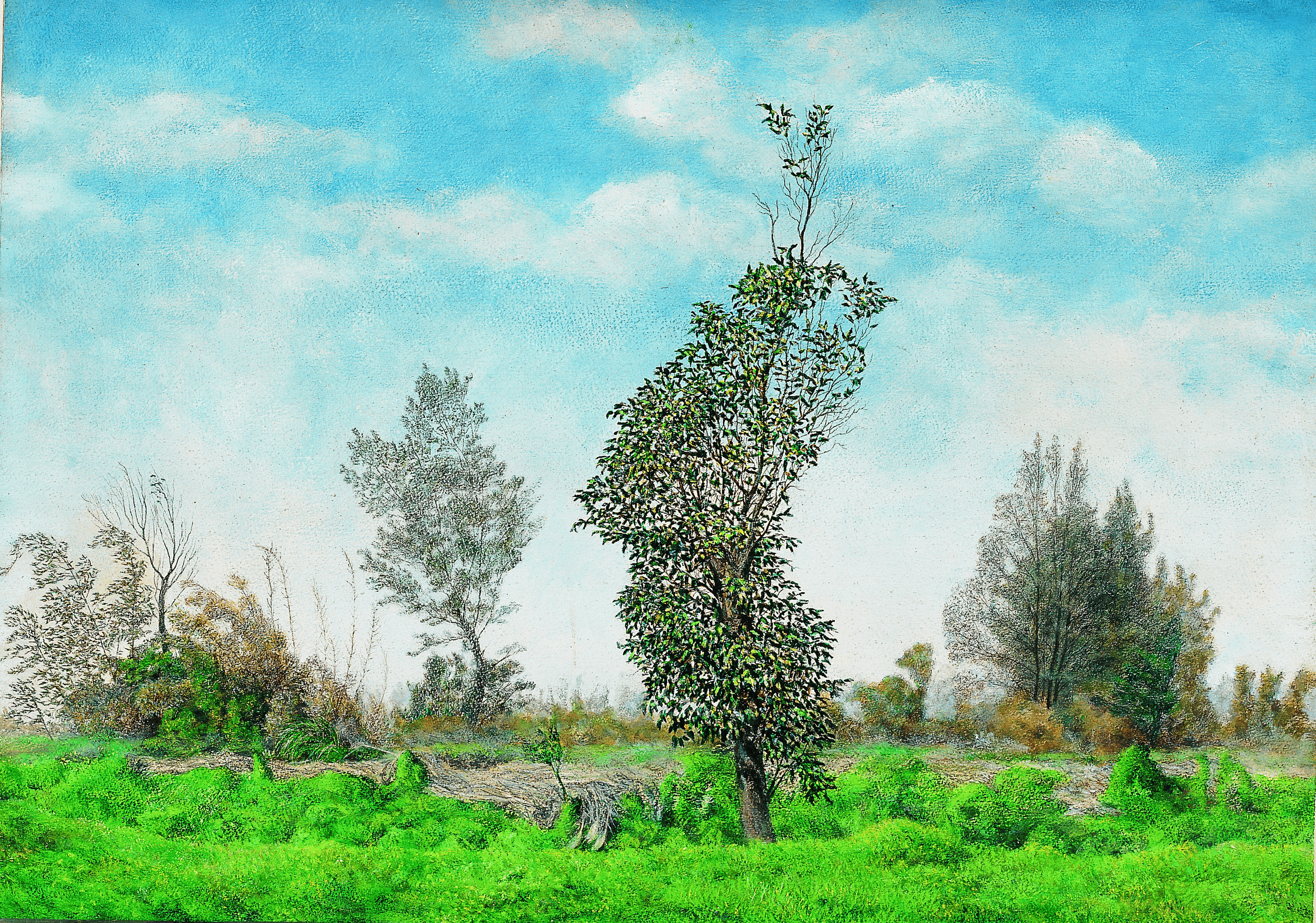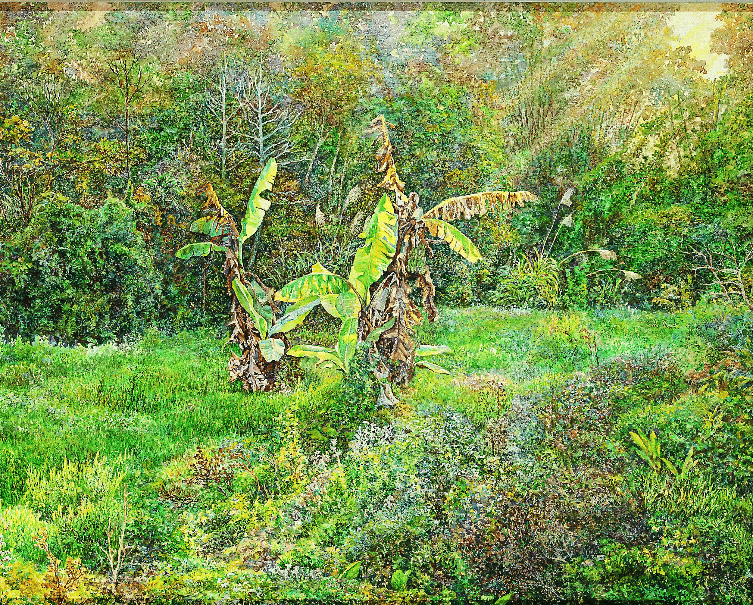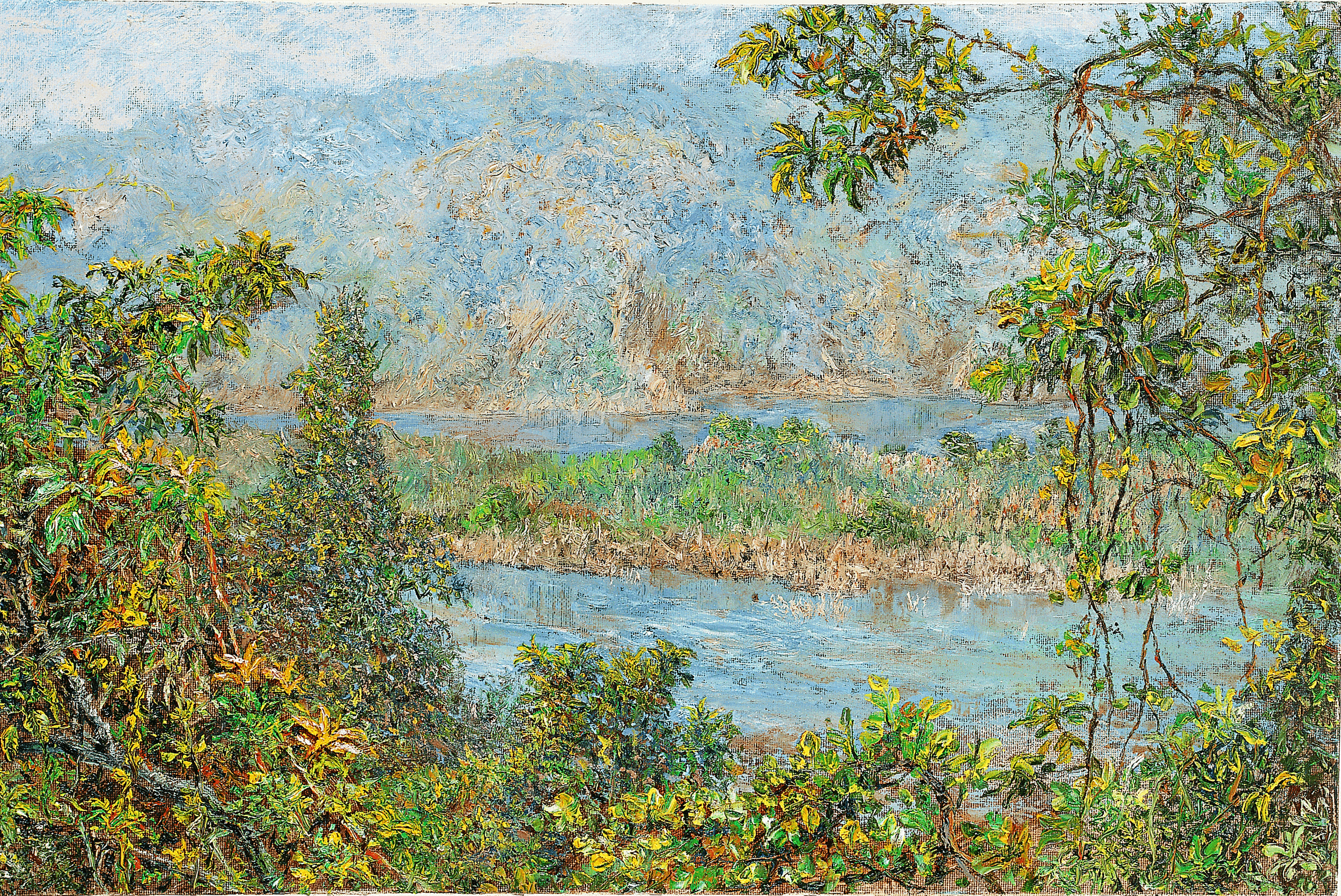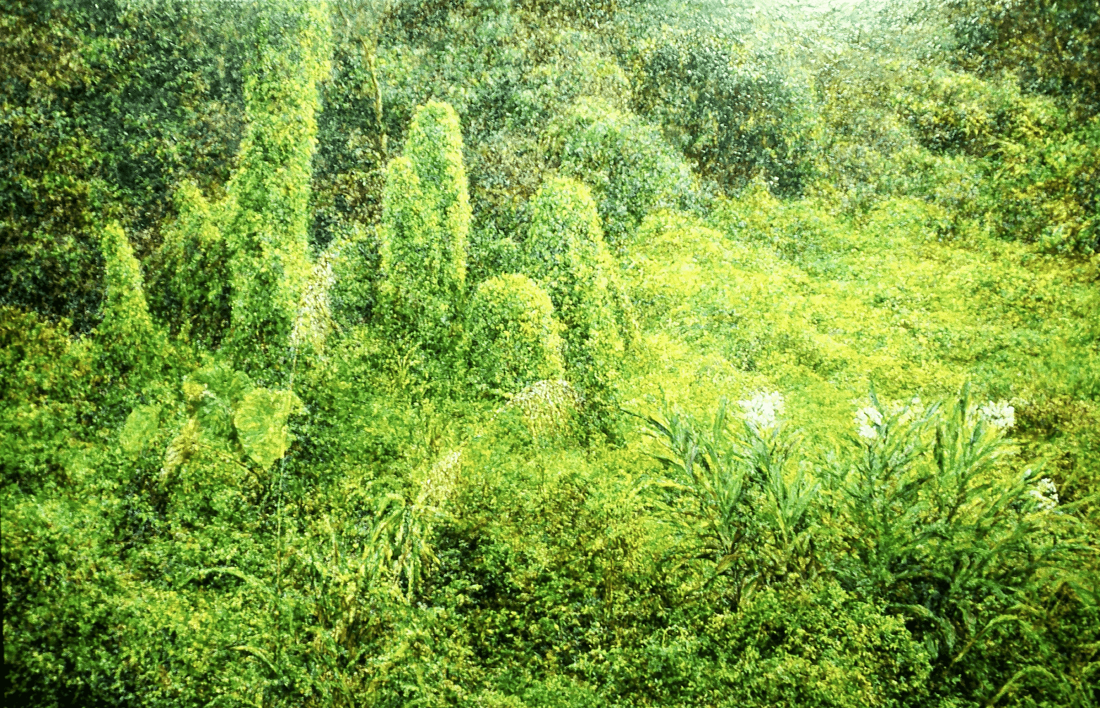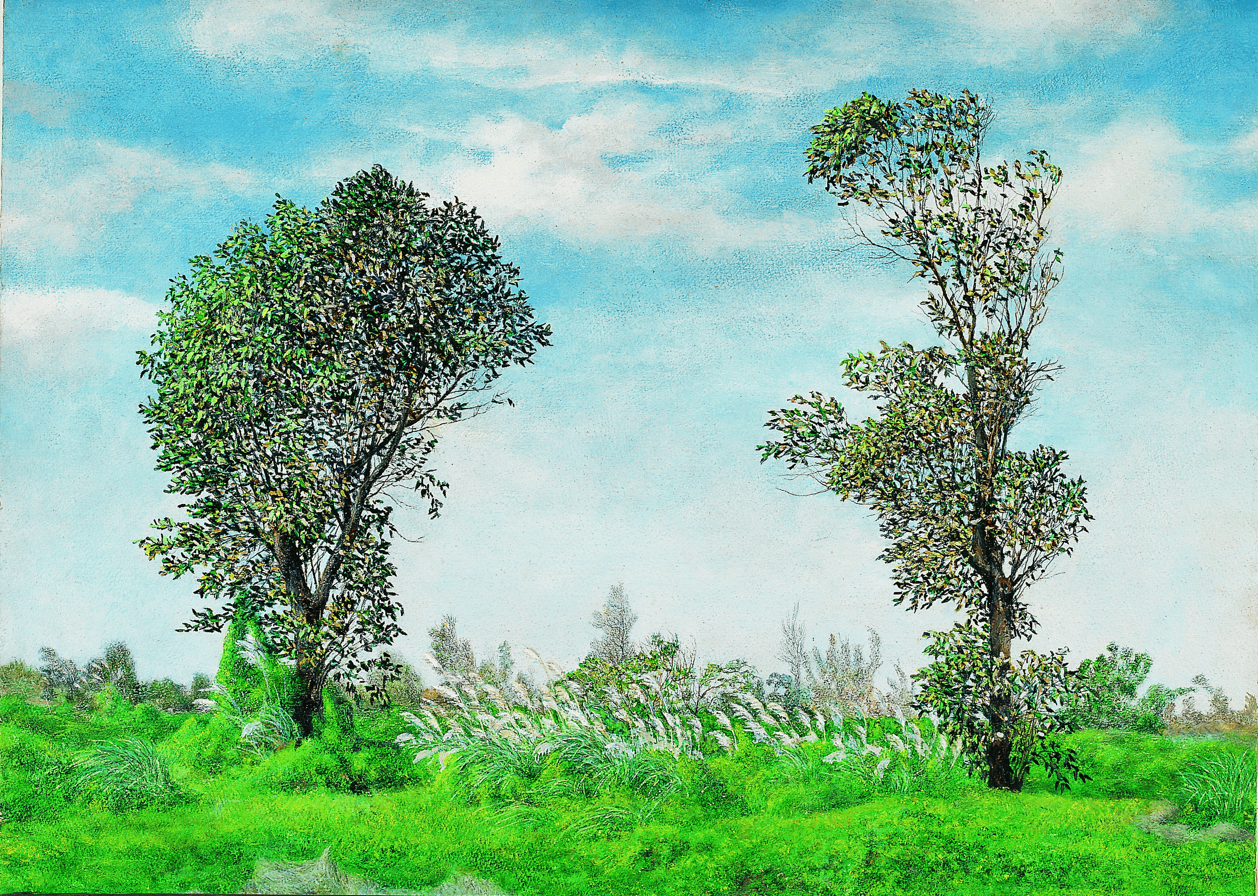 這張畫算是個人作畫歷程中的首次革命,學生時代學了一大堆技法與觀念,無論是印象派的點描,或是水墨的皴法,碰到眼前的草木都無用武之地。自己就像練了一身屠龍絕技,卻找不到半條龍可以宰,於是我只好一點一線地如實描繪。「我究竟看到的是甚麼?」; 「看」本身早已包含了經驗、動機、企圖和算計在裡面。要「如實地看」真是一件不容易的事,我得拋開習得的成見與觀感不可,只好用望遠鏡仔細地數樹葉和樹枝的數目,再忠實地還原數量、造型,盡量壓低主觀的感受。這樣也能畫!?今天看來還真好笑,不過這段日子留下了幾件至今看來還很得意的作品,我想是動機純正所致!