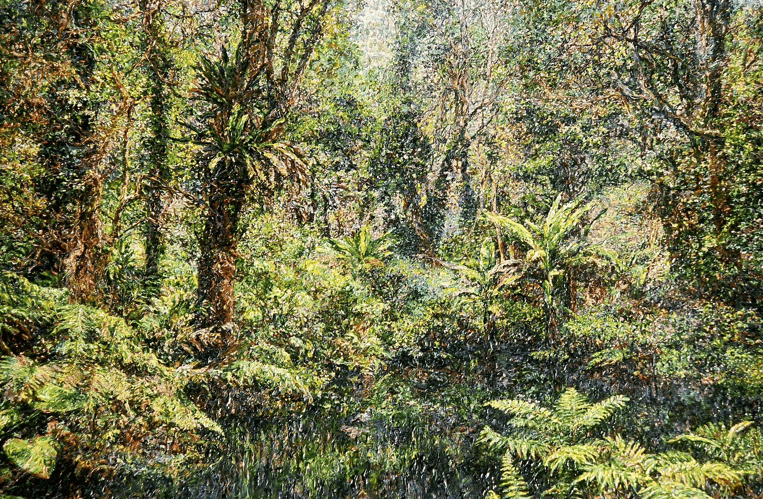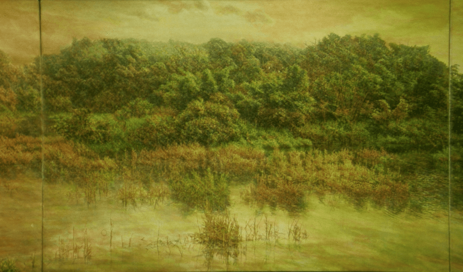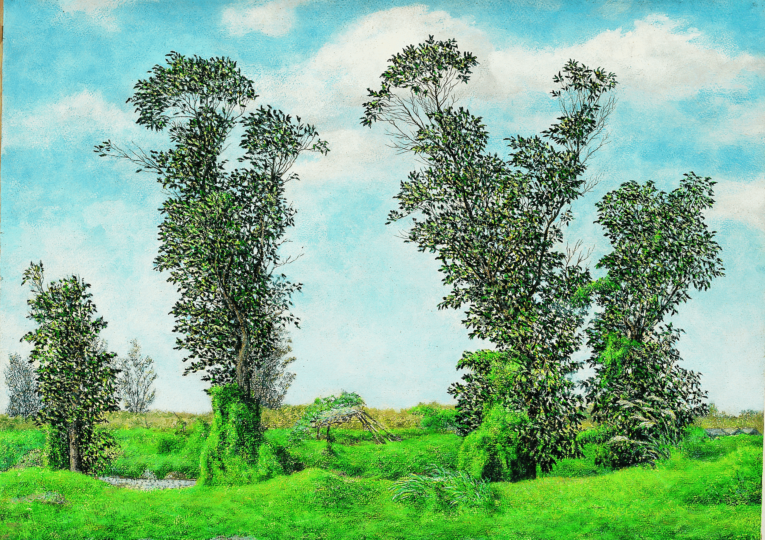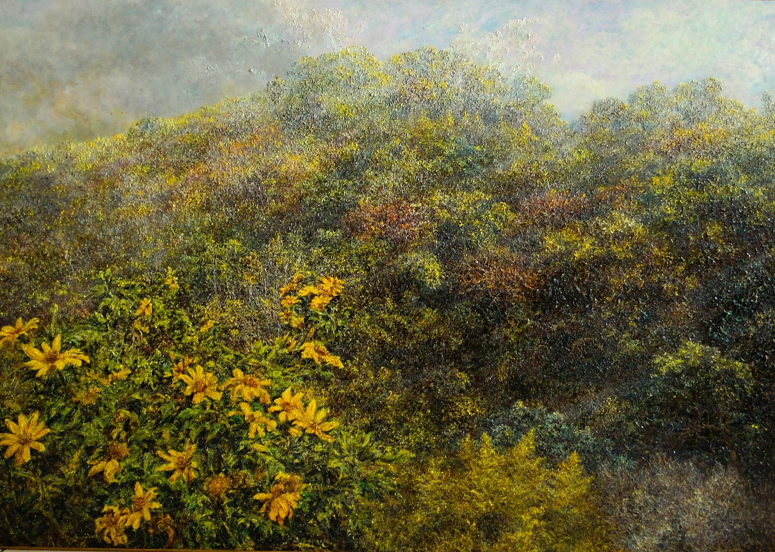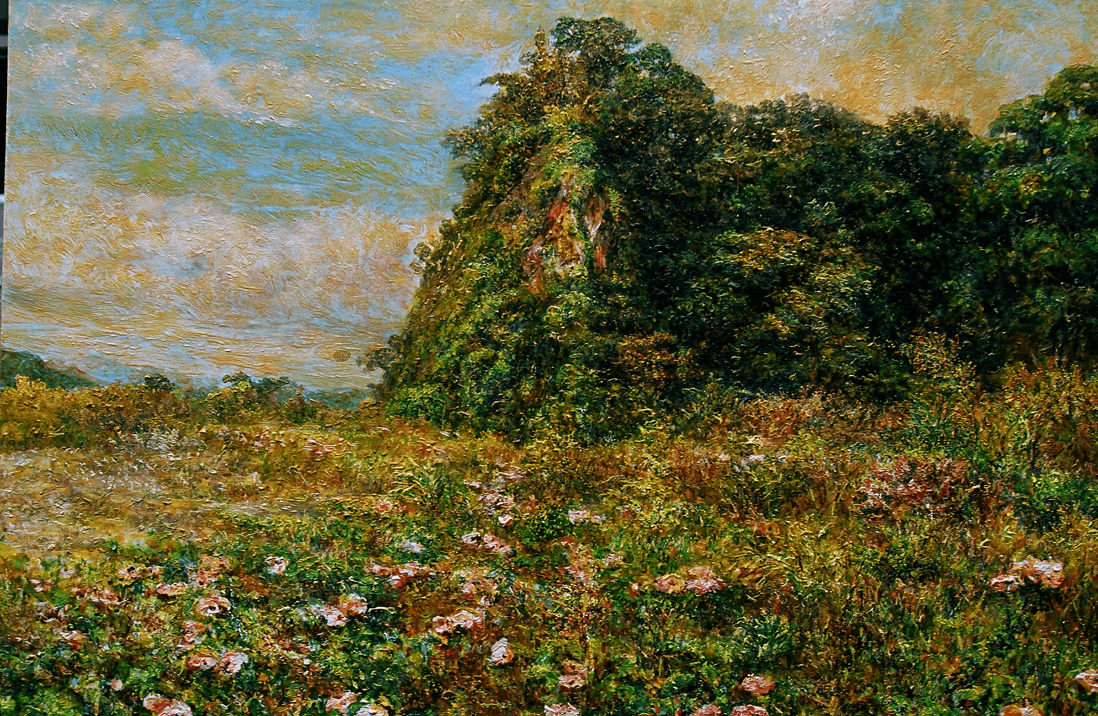 這張畫算是個人作畫歷程中的首次革命,學生時代學了一大堆技法與觀念,無論是印象派的點描,或是水墨的皴法,碰到眼前的草木都無用武之地。自己就像練了一身屠龍絕技,卻找不到半條龍可以宰,於是我只好一點一線地如實描繪。「我究竟看到的是甚麼?」; 「看」本身早已包含了經驗、動機、企圖和算計在裡面。要「如實地看」真是一件不容易的事,我得拋開習得的成見與觀感不可,只好用望遠鏡仔細地數樹葉和樹枝的數目,再忠實地還原數量、造型,盡量壓低主觀的感受。這樣也能畫!?今天看來還真好笑,不過這段日子留下了幾件至今看來還很得意的作品,我想是動機純正所致!