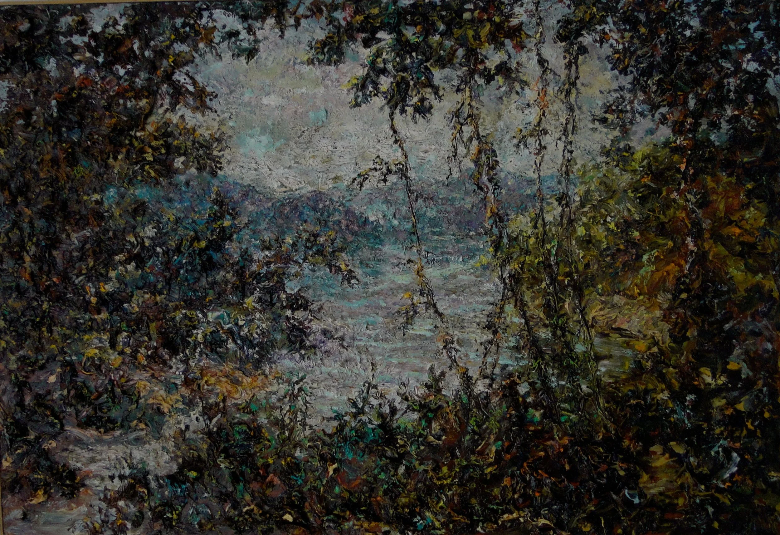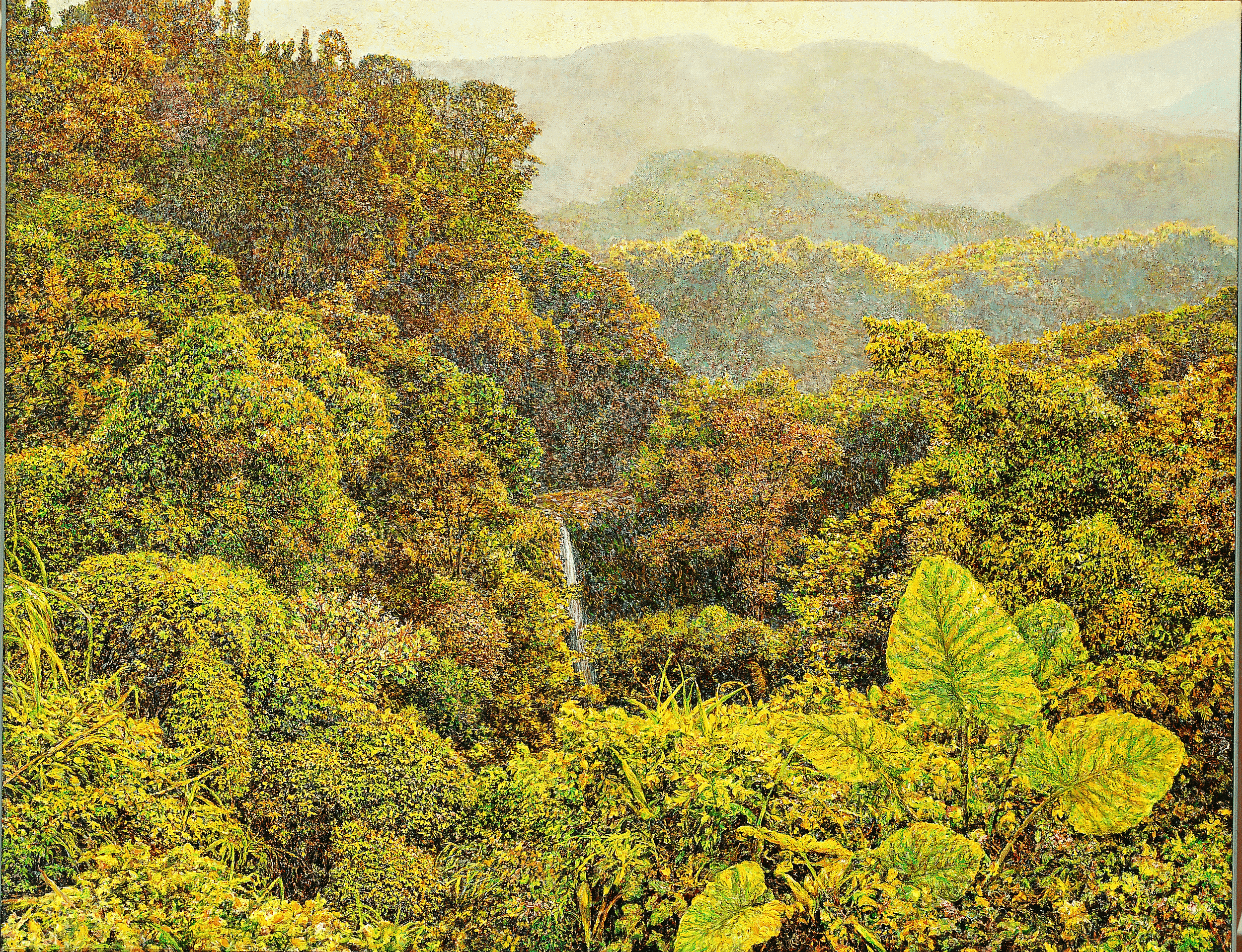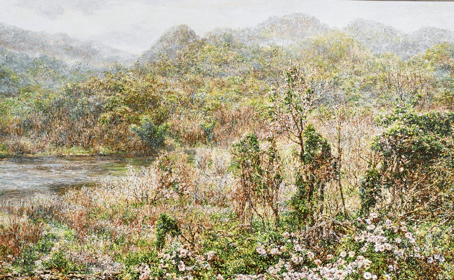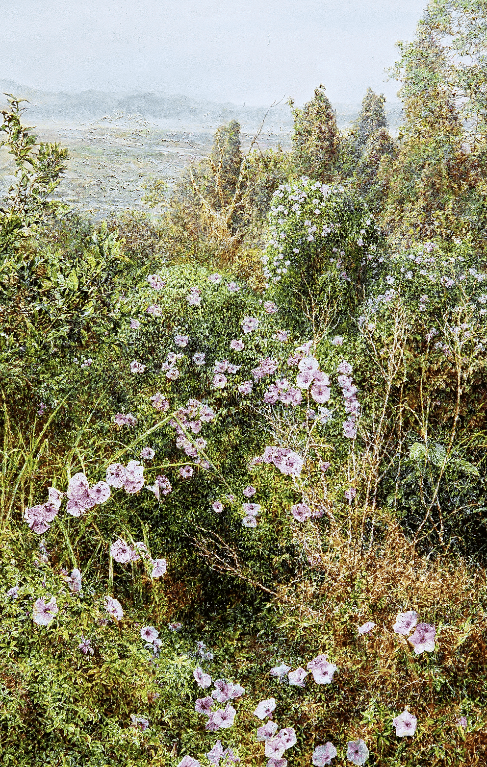 這張畫算是個人作畫歷程中的首次革命,學生時代學了一大堆技法與觀念,無論是印象派的點描,或是水墨的皴法,碰到眼前的草木都無用武之地。自己就像練了一身屠龍絕技,卻找不到半條龍可以宰,於是我只好一點一線地如實描繪。「我究竟看到的是甚麼?」; 「看」本身早已包含了經驗、動機、企圖和算計在裡面。要「如實地看」真是一件不容易的事,我得拋開習得的成見與觀感不可,只好用望遠鏡仔細地數樹葉和樹枝的數目,再忠實地還原數量、造型,盡量壓低主觀的感受。這樣也能畫!?今天看來還真好笑,不過這段日子留下了幾件至今看來還很得意的作品,我想是動機純正所致!