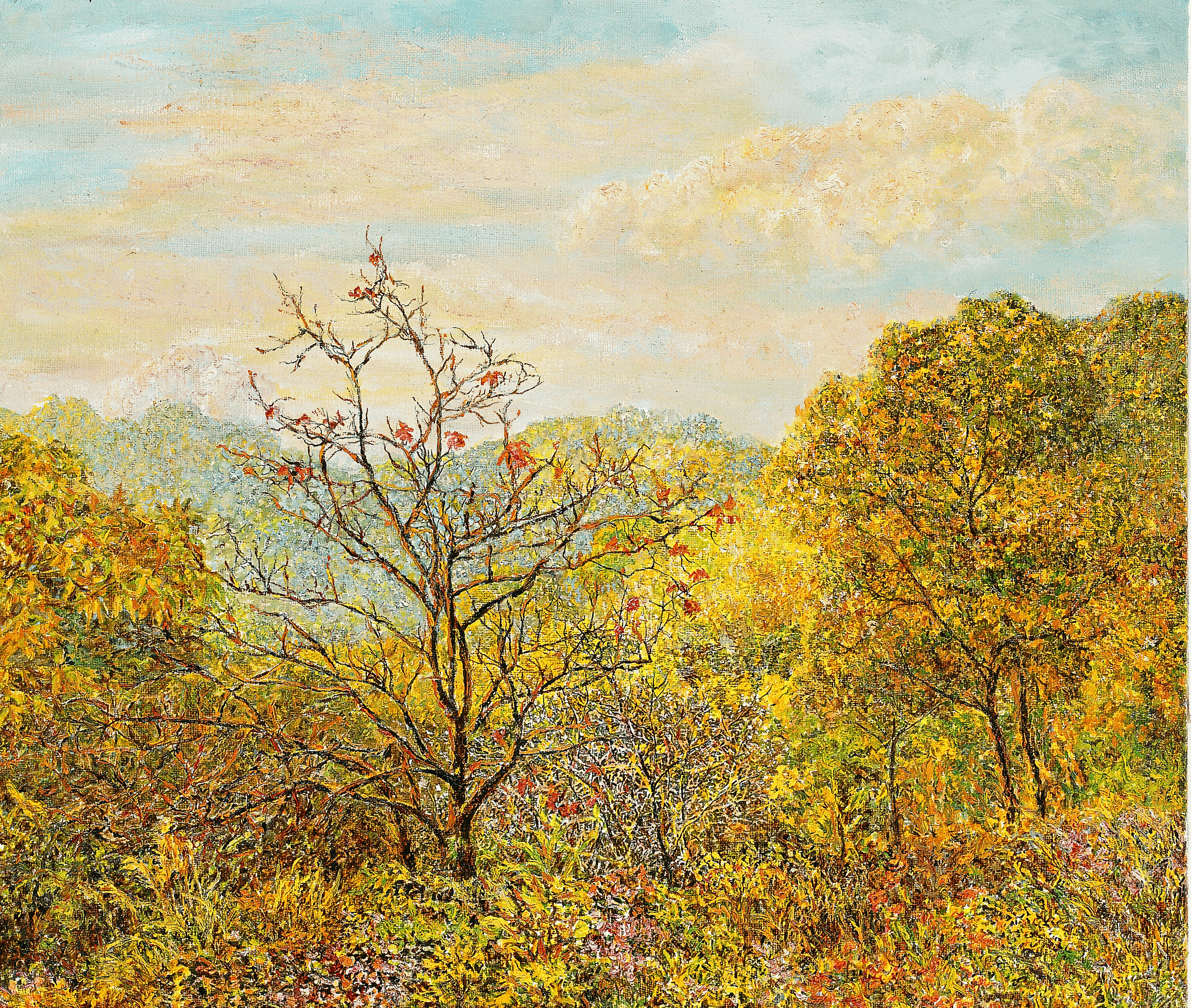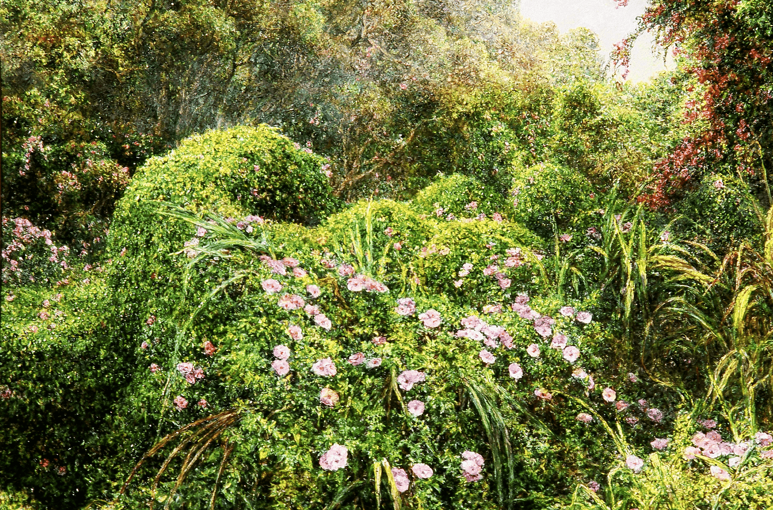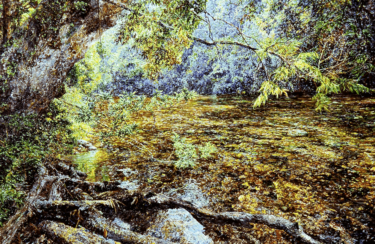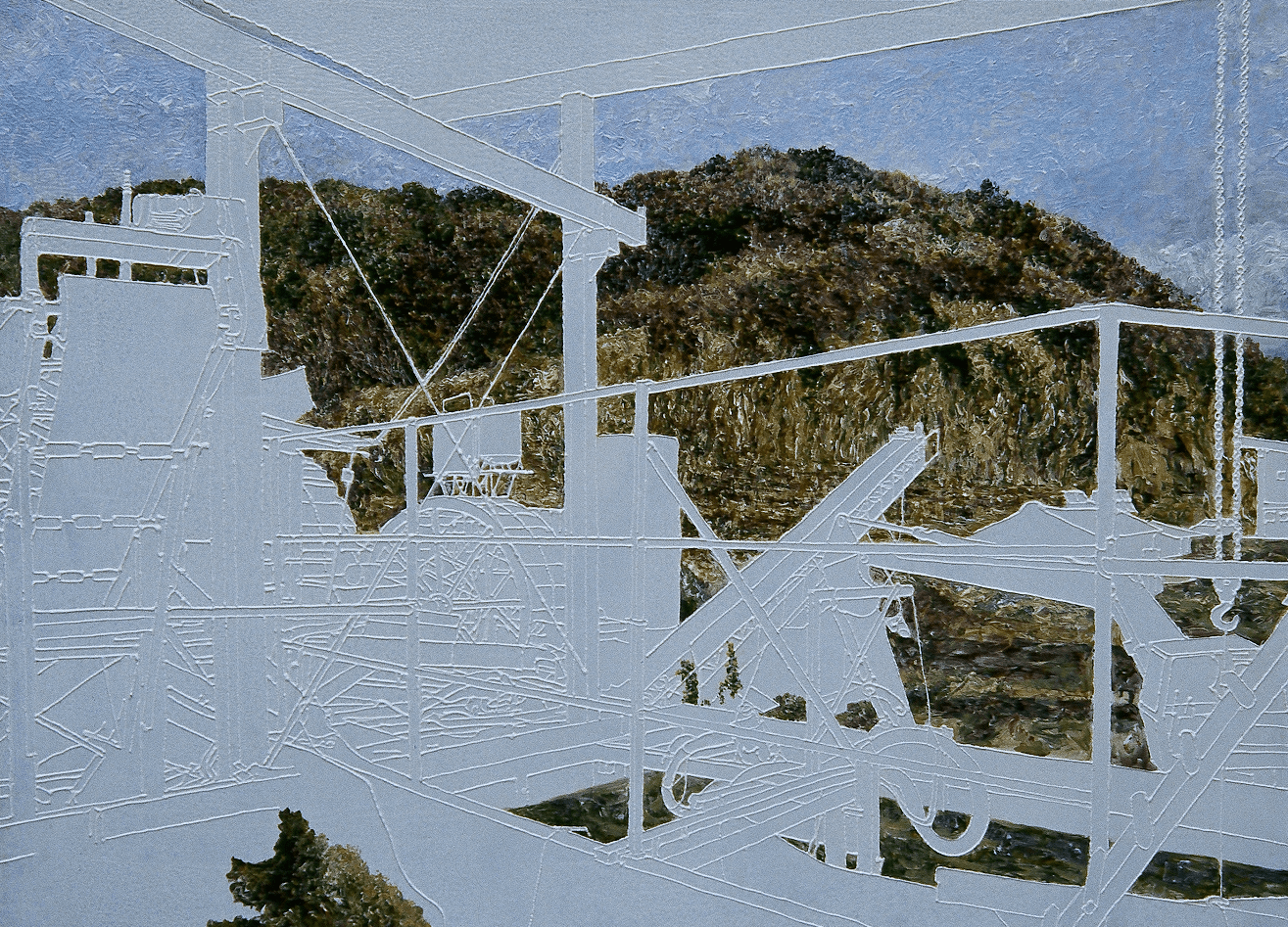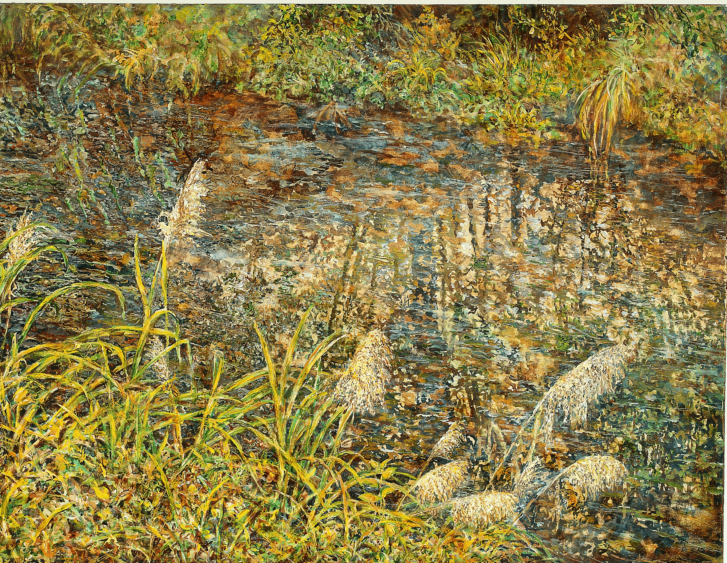 這張畫算是個人作畫歷程中的首次革命,學生時代學了一大堆技法與觀念,無論是印象派的點描,或是水墨的皴法,碰到眼前的草木都無用武之地。自己就像練了一身屠龍絕技,卻找不到半條龍可以宰,於是我只好一點一線地如實描繪。「我究竟看到的是甚麼?」; 「看」本身早已包含了經驗、動機、企圖和算計在裡面。要「如實地看」真是一件不容易的事,我得拋開習得的成見與觀感不可,只好用望遠鏡仔細地數樹葉和樹枝的數目,再忠實地還原數量、造型,盡量壓低主觀的感受。這樣也能畫!?今天看來還真好笑,不過這段日子留下了幾件至今看來還很得意的作品,我想是動機純正所致!