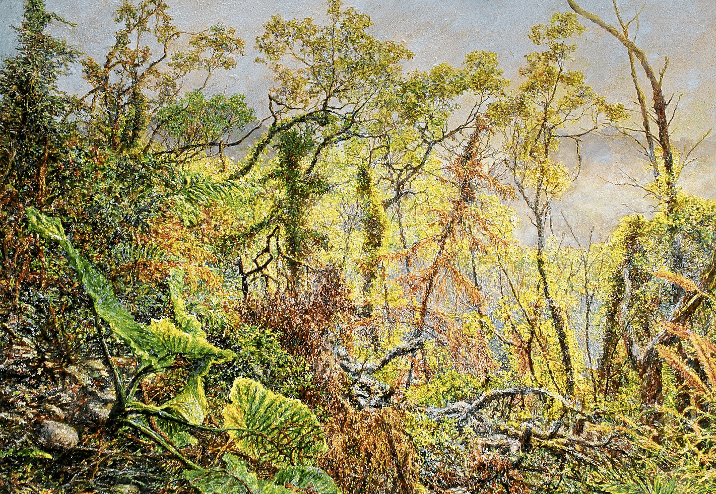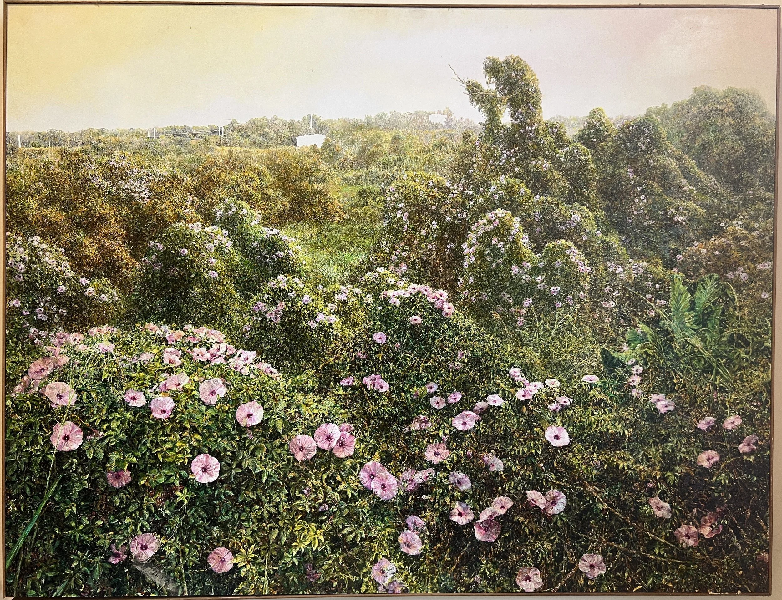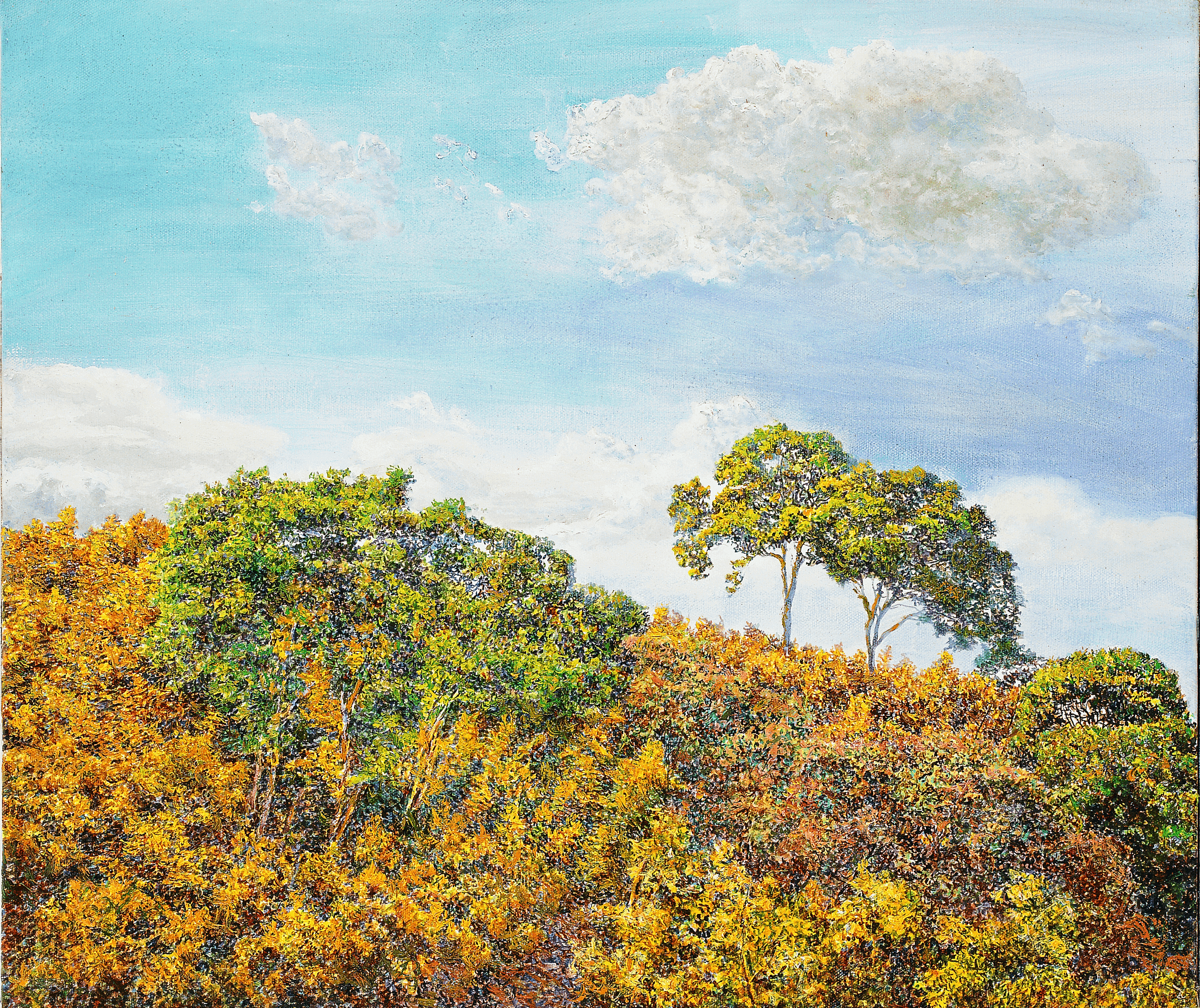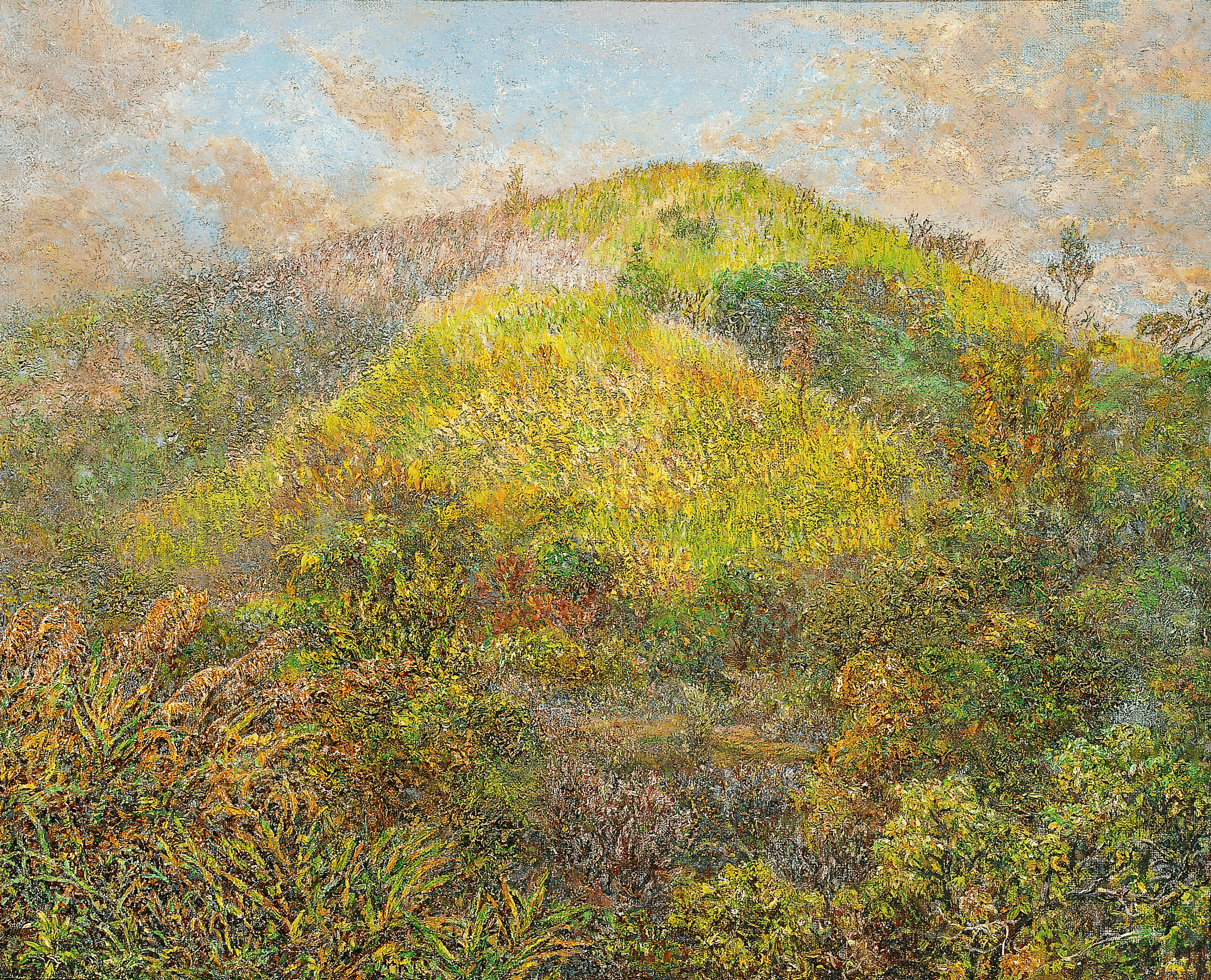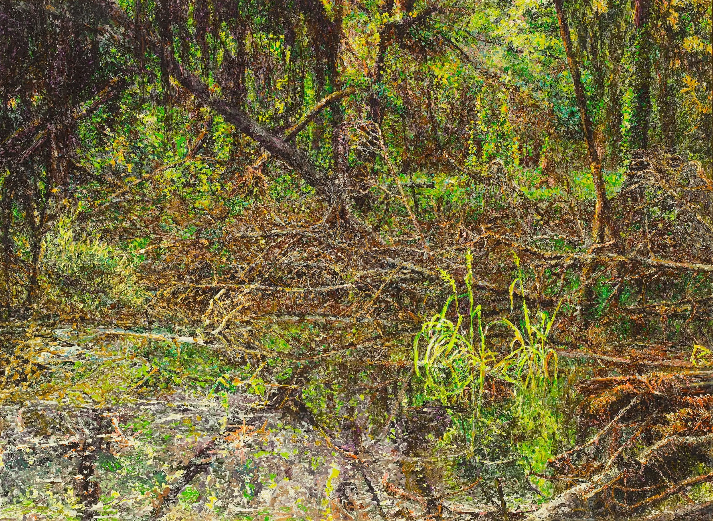 這張畫算是個人作畫歷程中的首次革命,學生時代學了一大堆技法與觀念,無論是印象派的點描,或是水墨的皴法,碰到眼前的草木都無用武之地。自己就像練了一身屠龍絕技,卻找不到半條龍可以宰,於是我只好一點一線地如實描繪。「我究竟看到的是甚麼?」; 「看」本身早已包含了經驗、動機、企圖和算計在裡面。要「如實地看」真是一件不容易的事,我得拋開習得的成見與觀感不可,只好用望遠鏡仔細地數樹葉和樹枝的數目,再忠實地還原數量、造型,盡量壓低主觀的感受。這樣也能畫!?今天看來還真好笑,不過這段日子留下了幾件至今看來還很得意的作品,我想是動機純正所致!