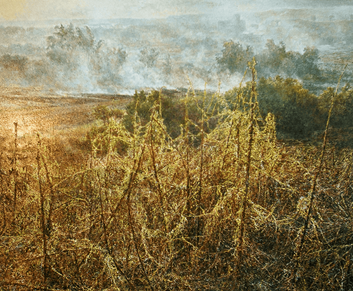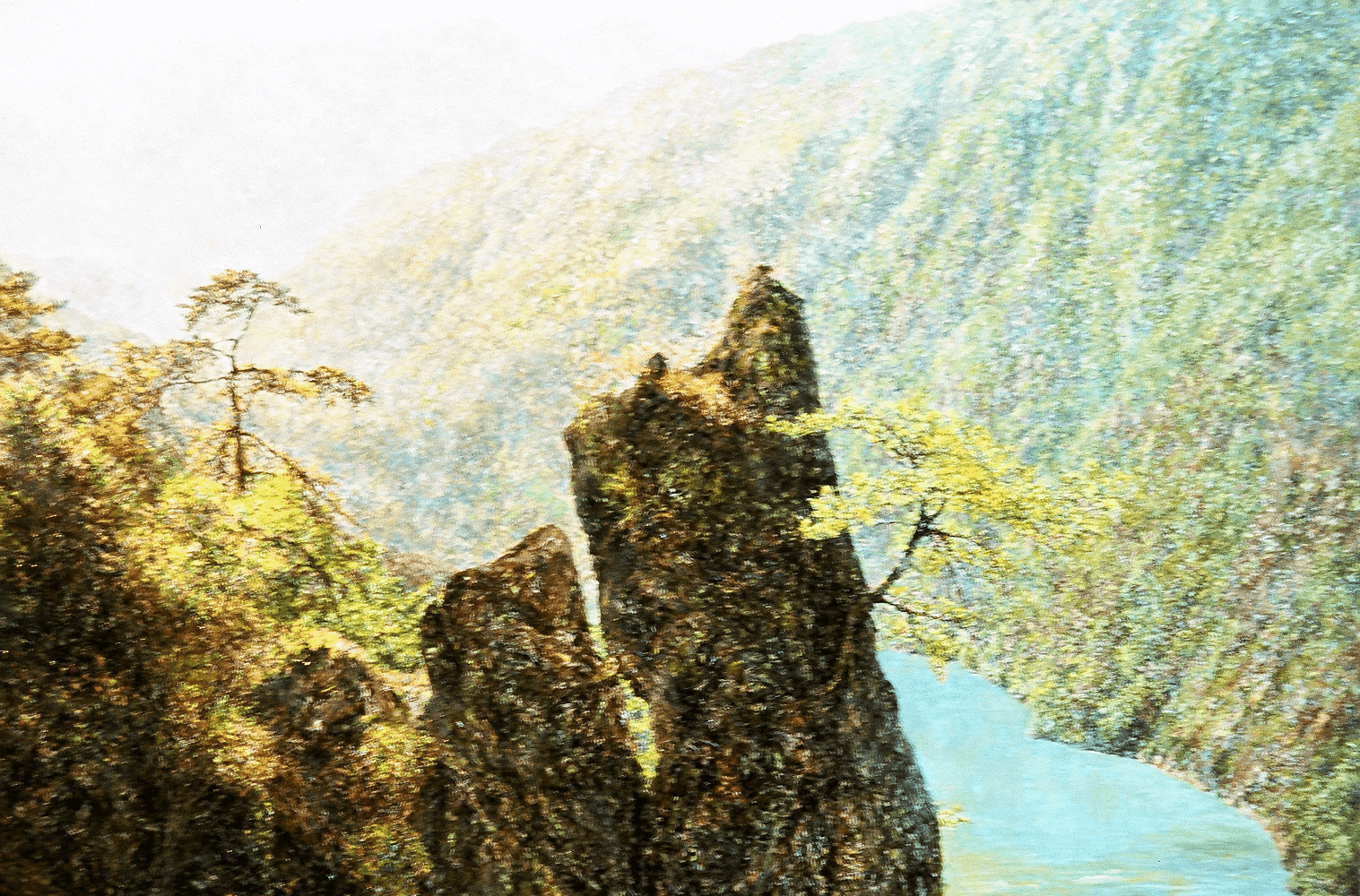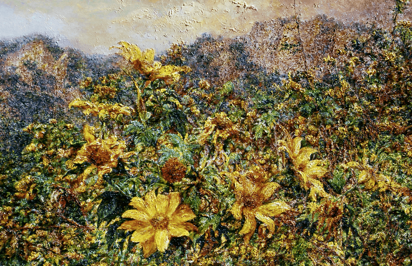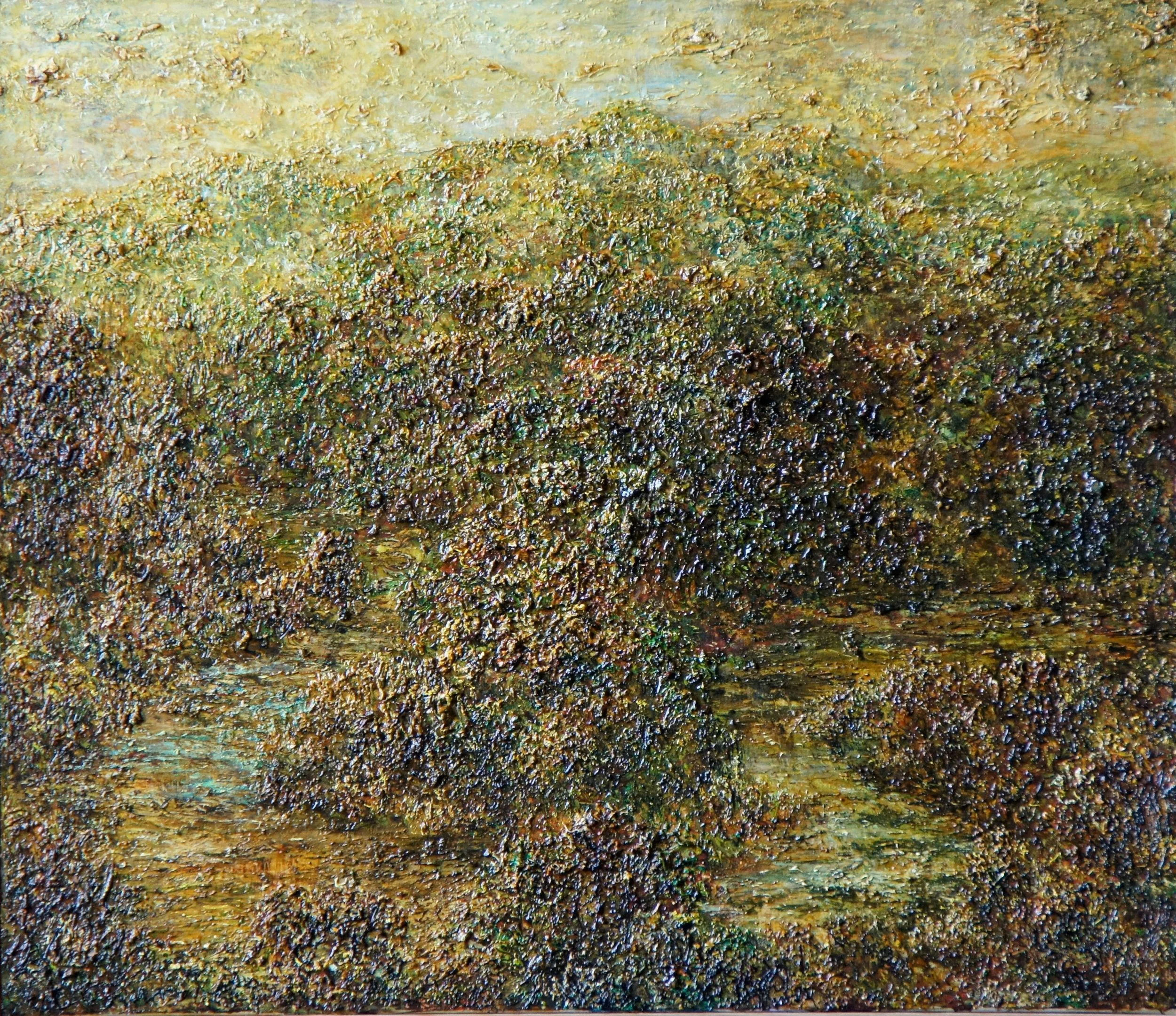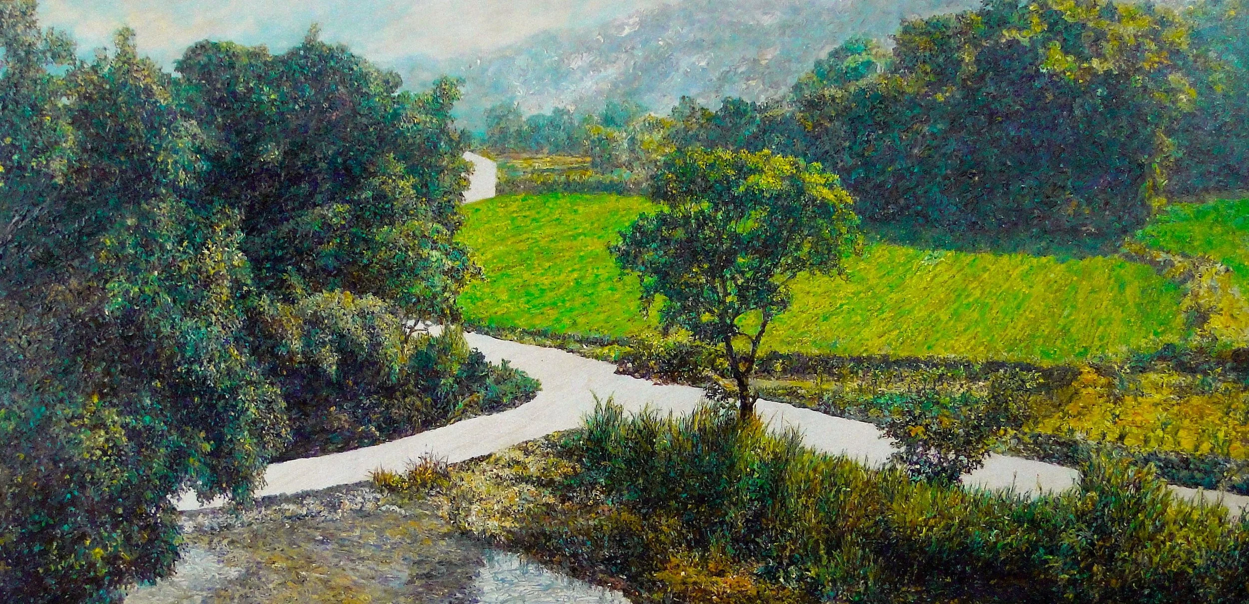 這張畫算是個人作畫歷程中的首次革命,學生時代學了一大堆技法與觀念,無論是印象派的點描,或是水墨的皴法,碰到眼前的草木都無用武之地。自己就像練了一身屠龍絕技,卻找不到半條龍可以宰,於是我只好一點一線地如實描繪。「我究竟看到的是甚麼?」; 「看」本身早已包含了經驗、動機、企圖和算計在裡面。要「如實地看」真是一件不容易的事,我得拋開習得的成見與觀感不可,只好用望遠鏡仔細地數樹葉和樹枝的數目,再忠實地還原數量、造型,盡量壓低主觀的感受。這樣也能畫!?今天看來還真好笑,不過這段日子留下了幾件至今看來還很得意的作品,我想是動機純正所致!