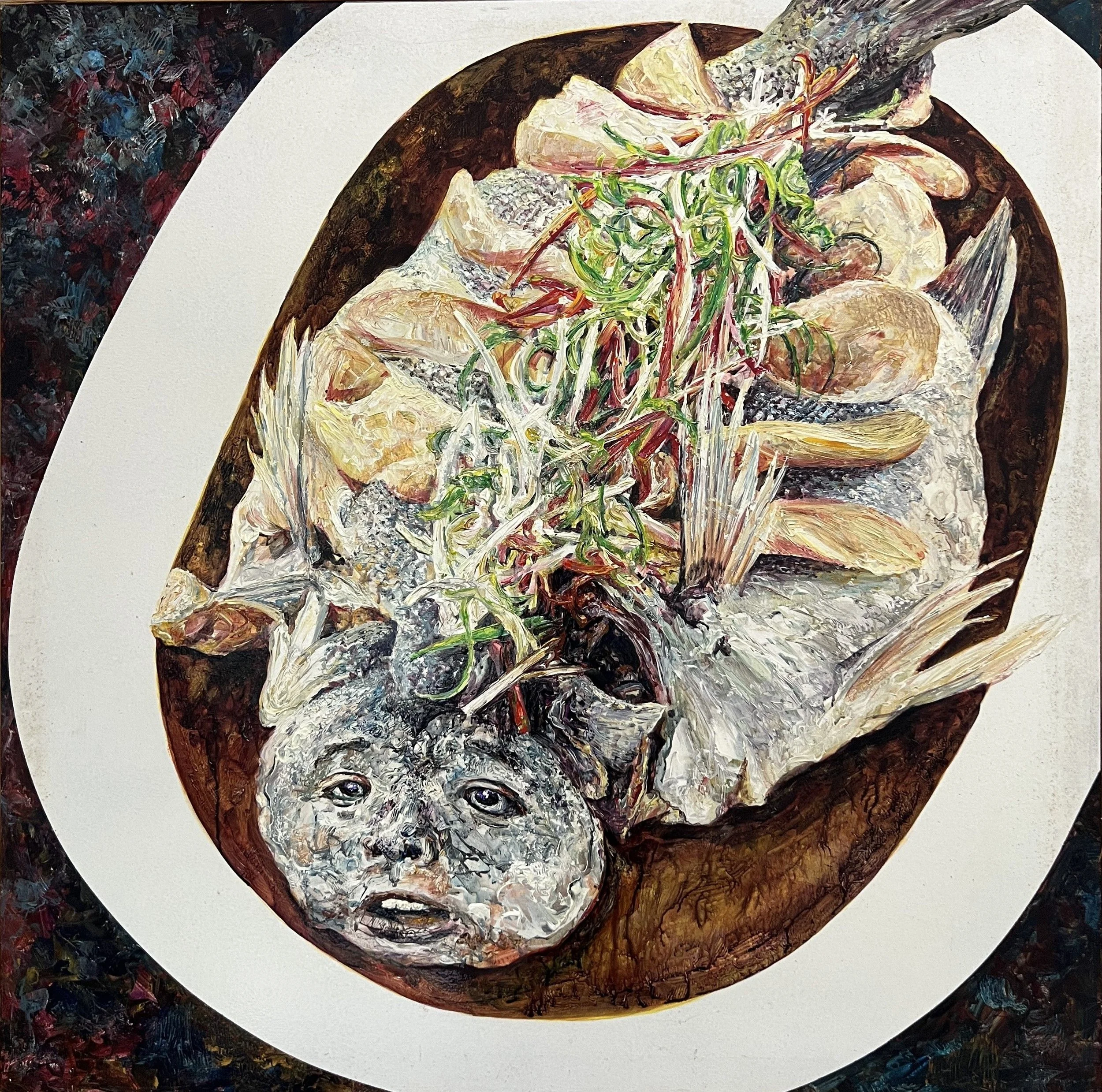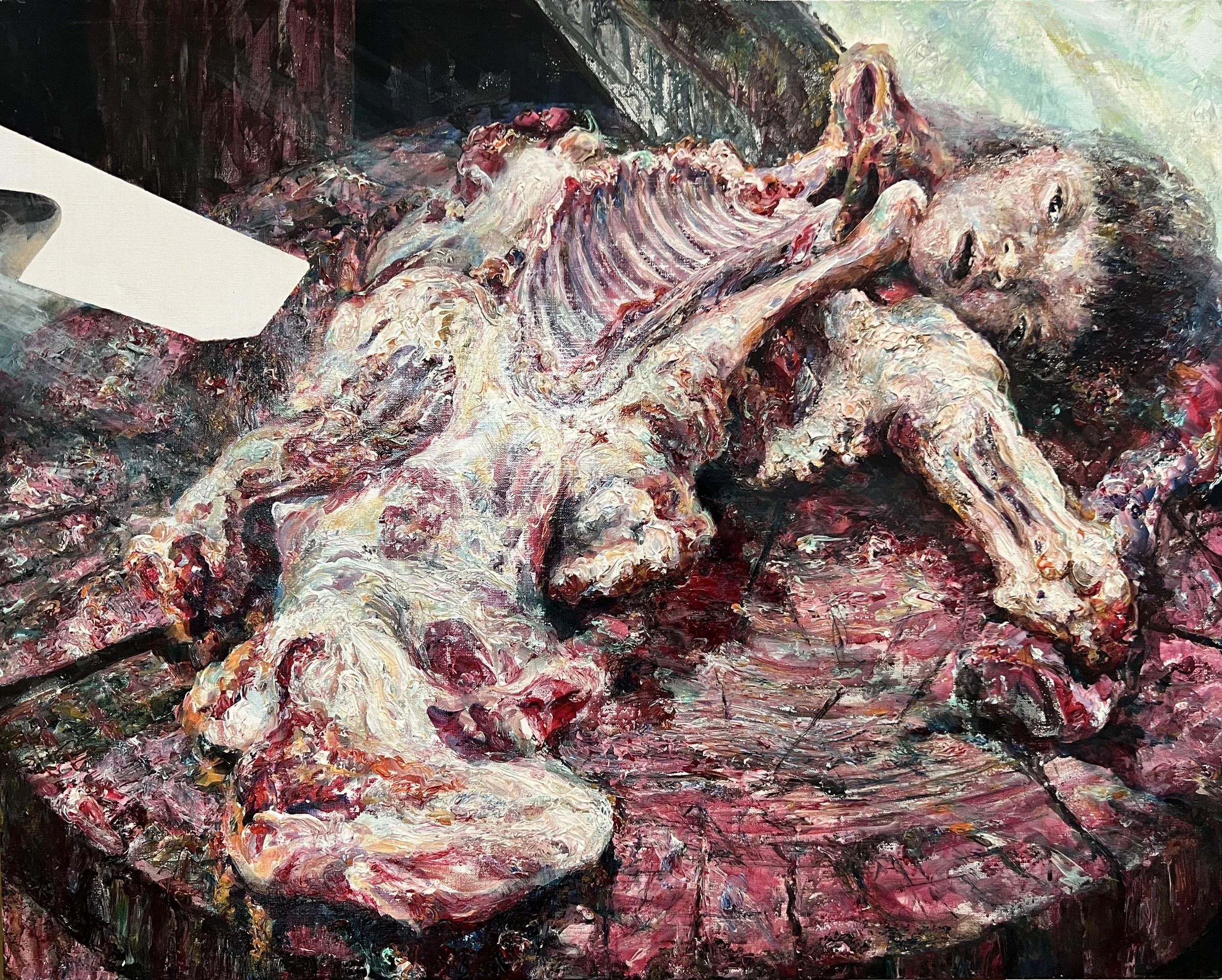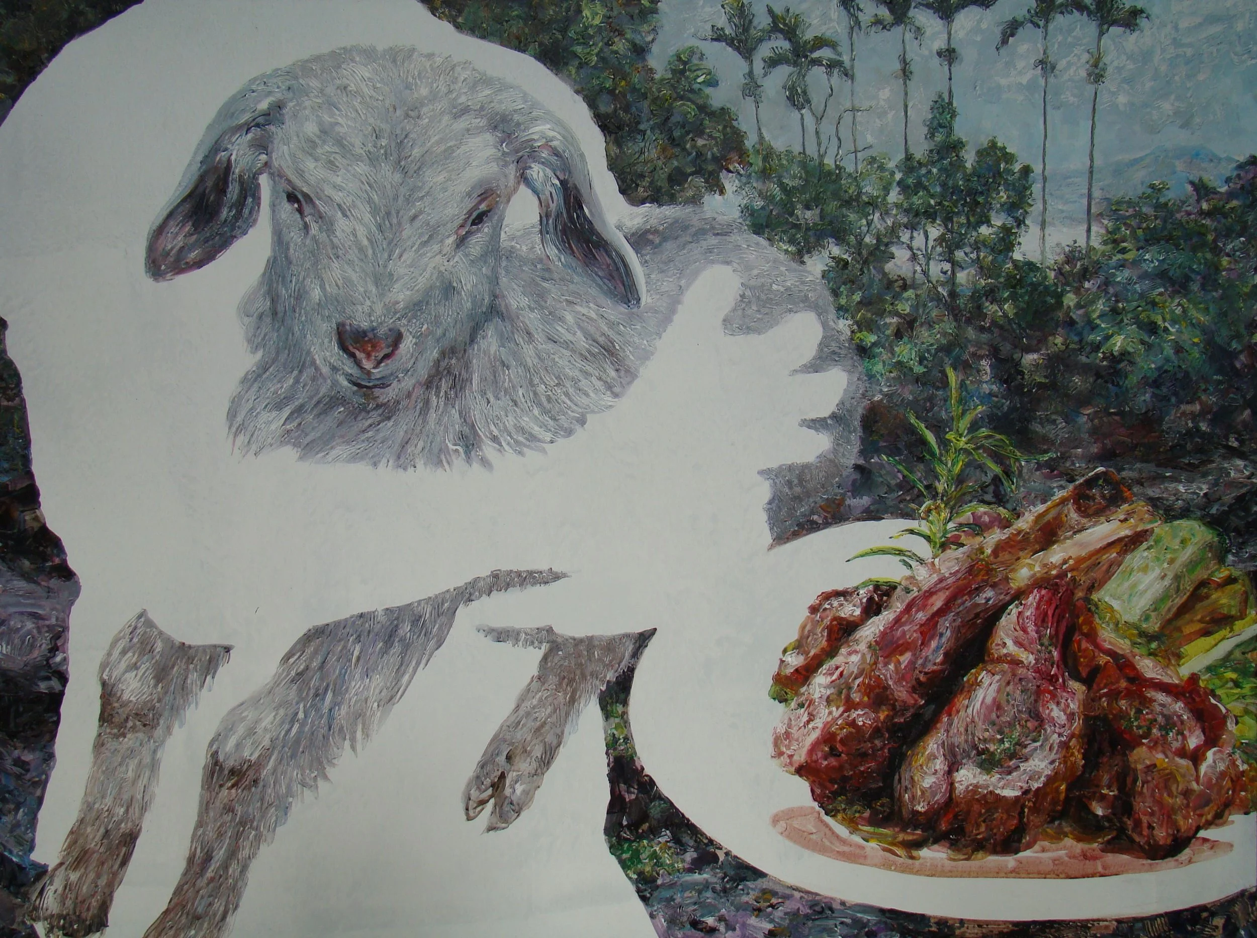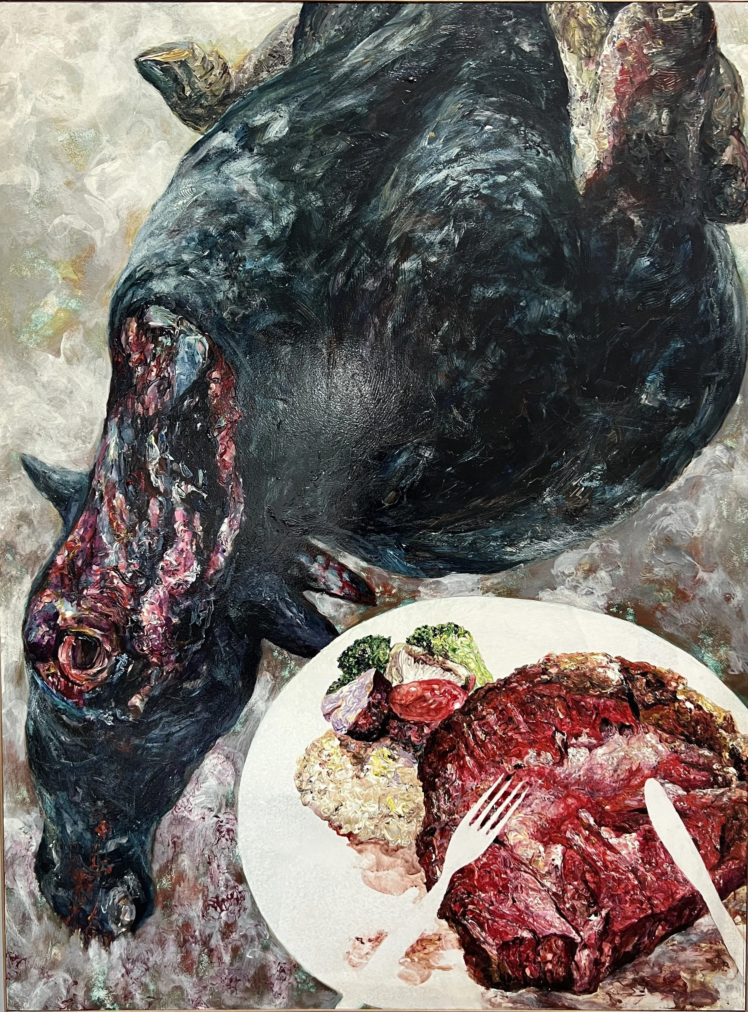 這張算是自畫像,我就是這般無可奈何地看著世界,當你了解每頭牛被殺,每條魚被捕,你都有參一腳。每頭豬、每頭羊被宰的同時,你都間接地捅上一刀。每個人餓死、互相殘害,你都無法置身度外,這時藝術創作動機已經不是遊戲衝動,不是自我表現、不是裝飾、不是換得鈔票所能承載,它已經是天地大悲加諸汝身,誓為菩薩行的願力。