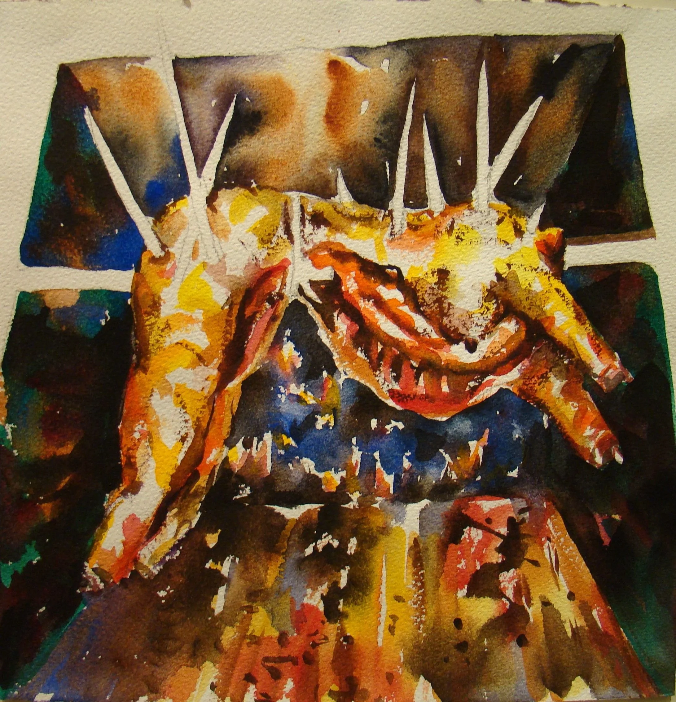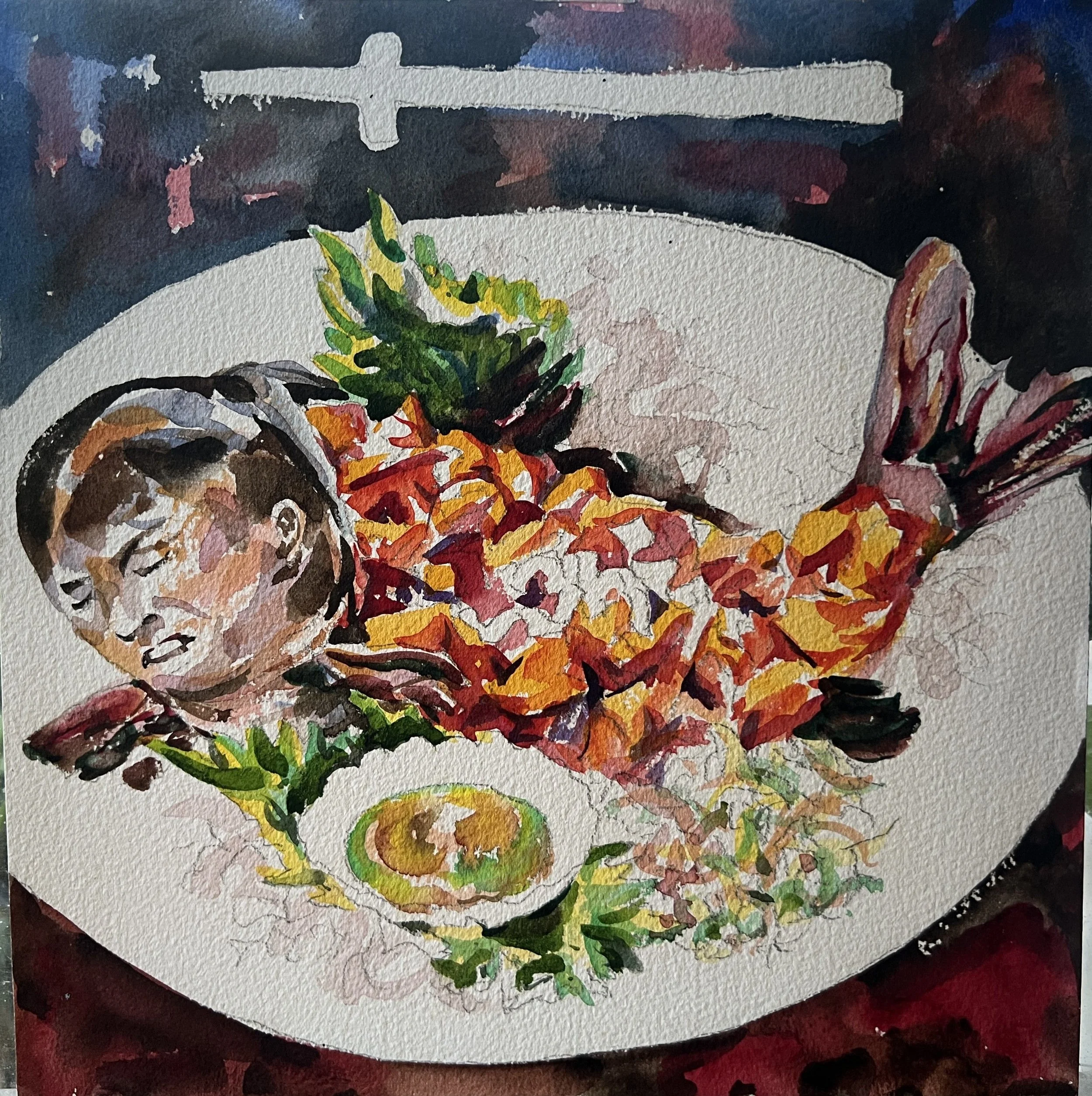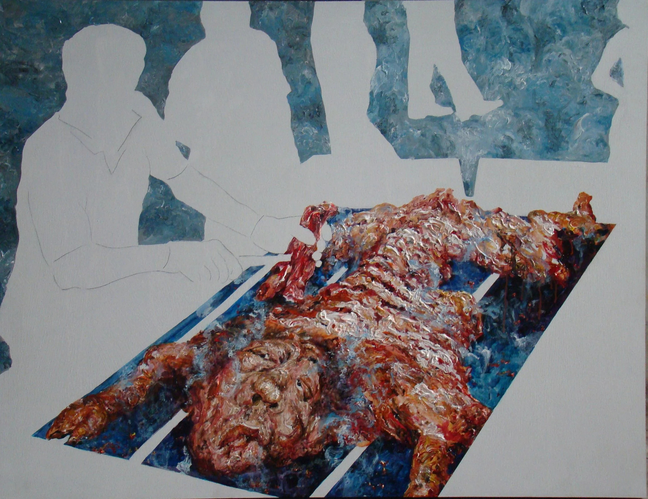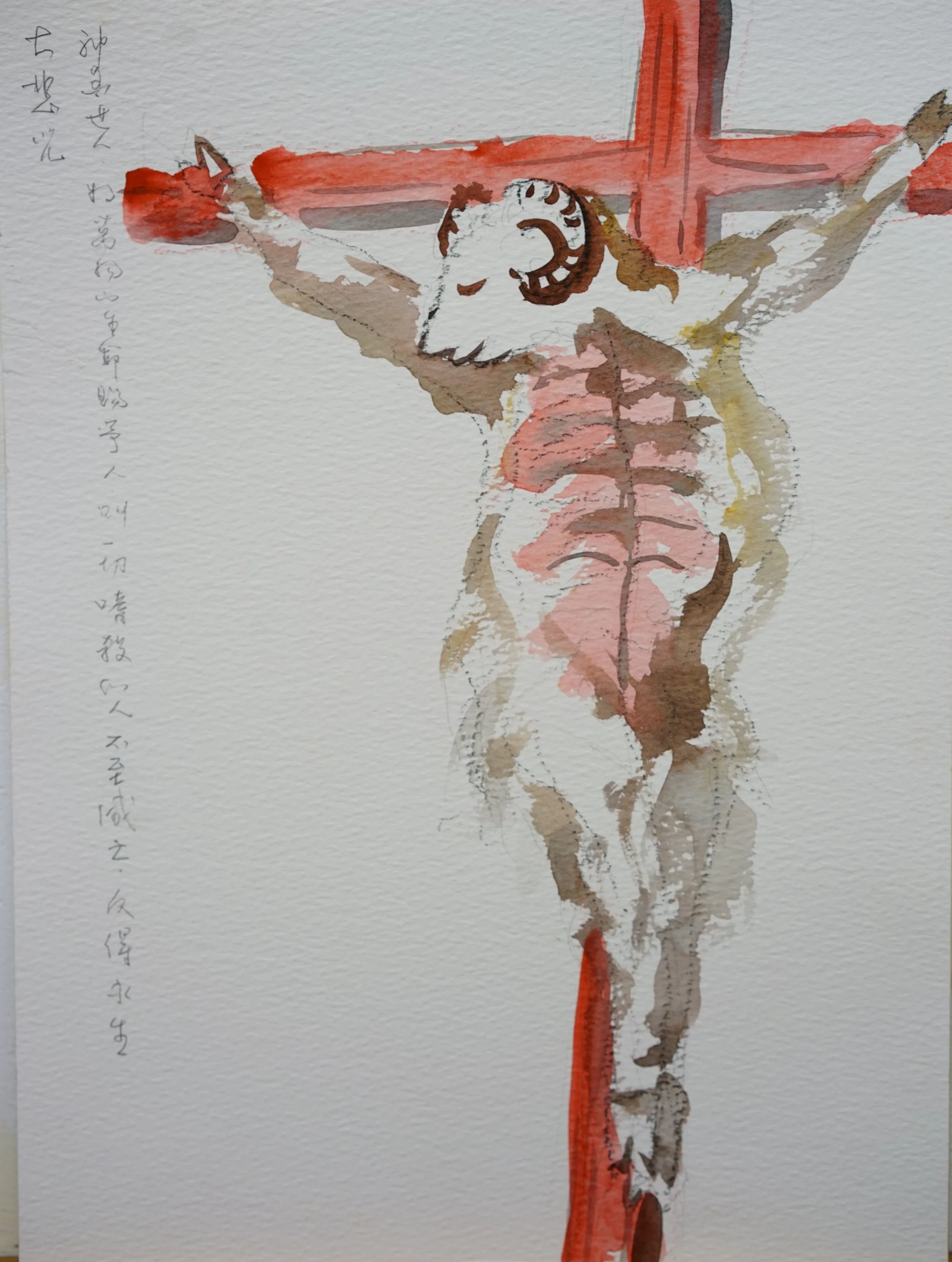 這張算是自畫像,我就是這般無可奈何地看著世界,當你了解每頭牛被殺,每條魚被捕,你都有參一腳。每頭豬、每頭羊被宰的同時,你都間接地捅上一刀。每個人餓死、互相殘害,你都無法置身度外,這時藝術創作動機已經不是遊戲衝動,不是自我表現、不是裝飾、不是換得鈔票所能承載,它已經是天地大悲加諸汝身,誓為菩薩行的願力。