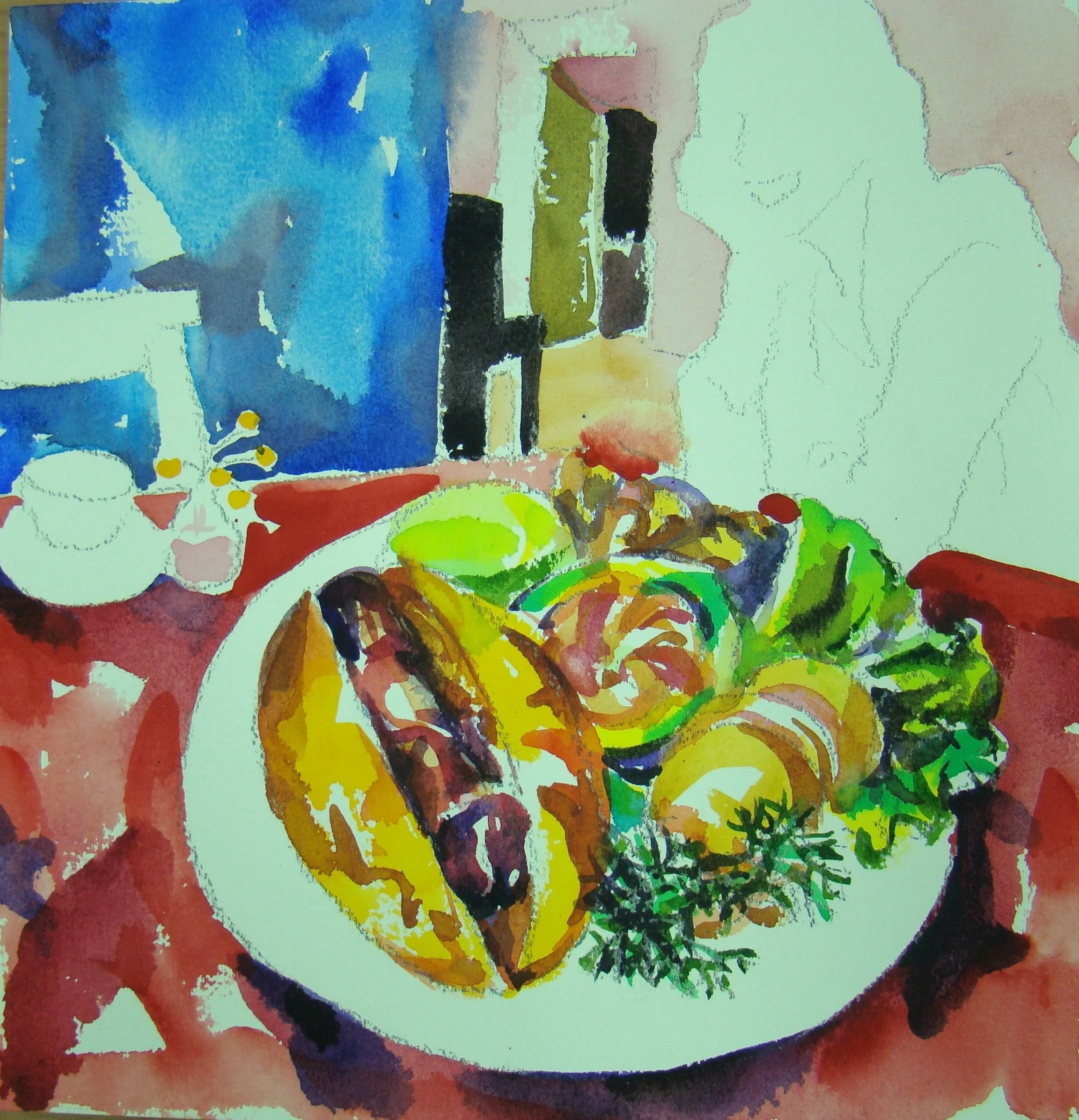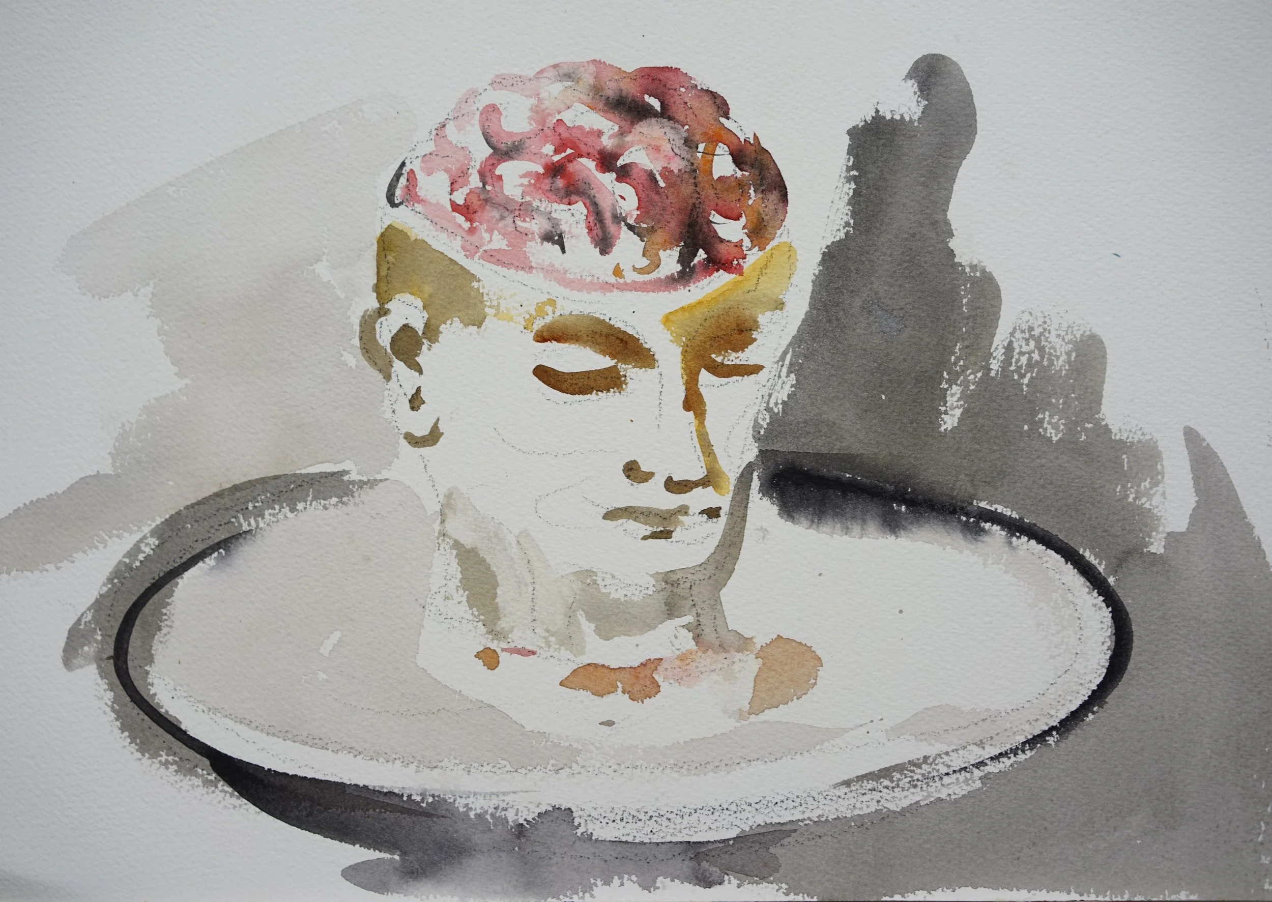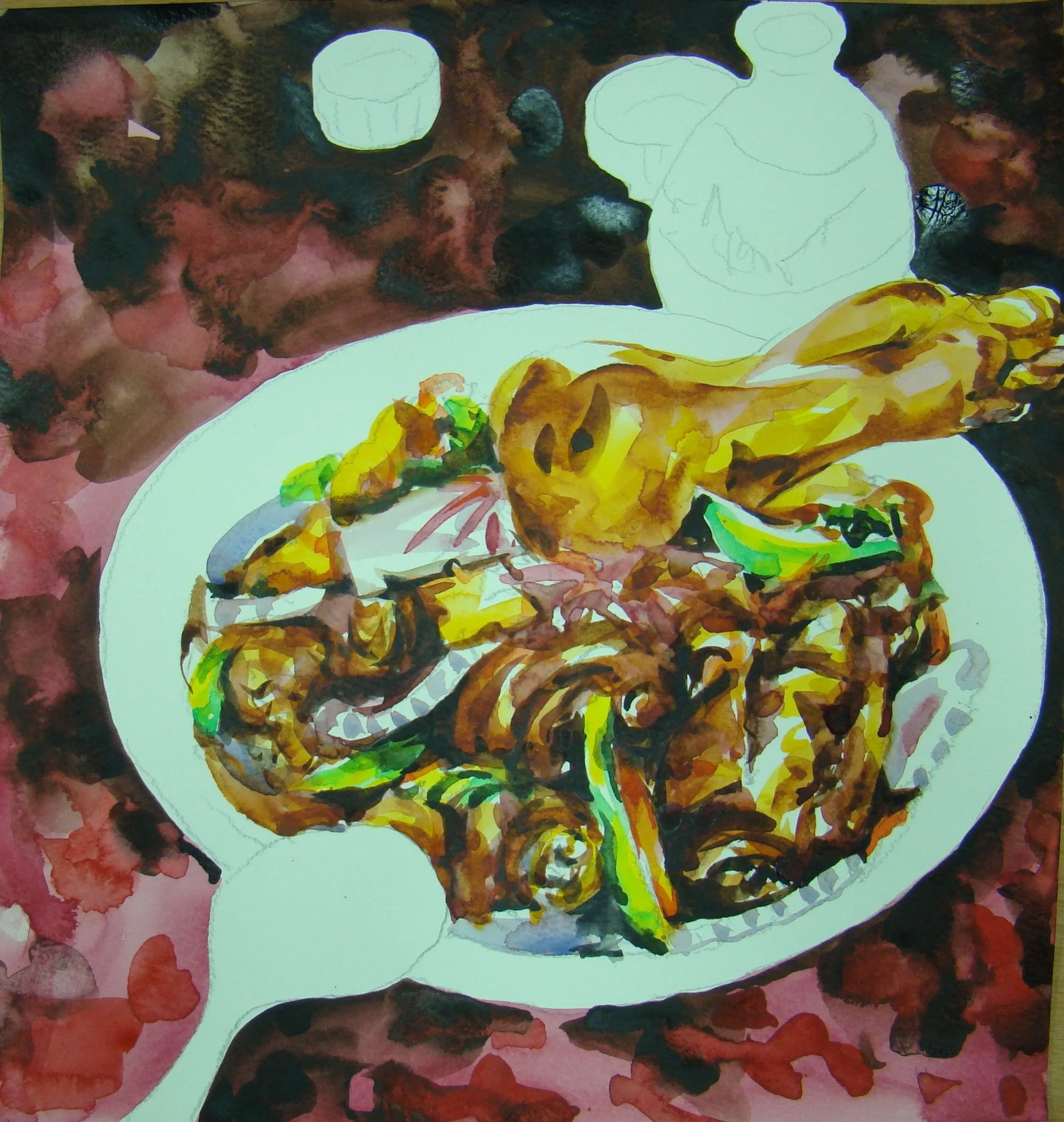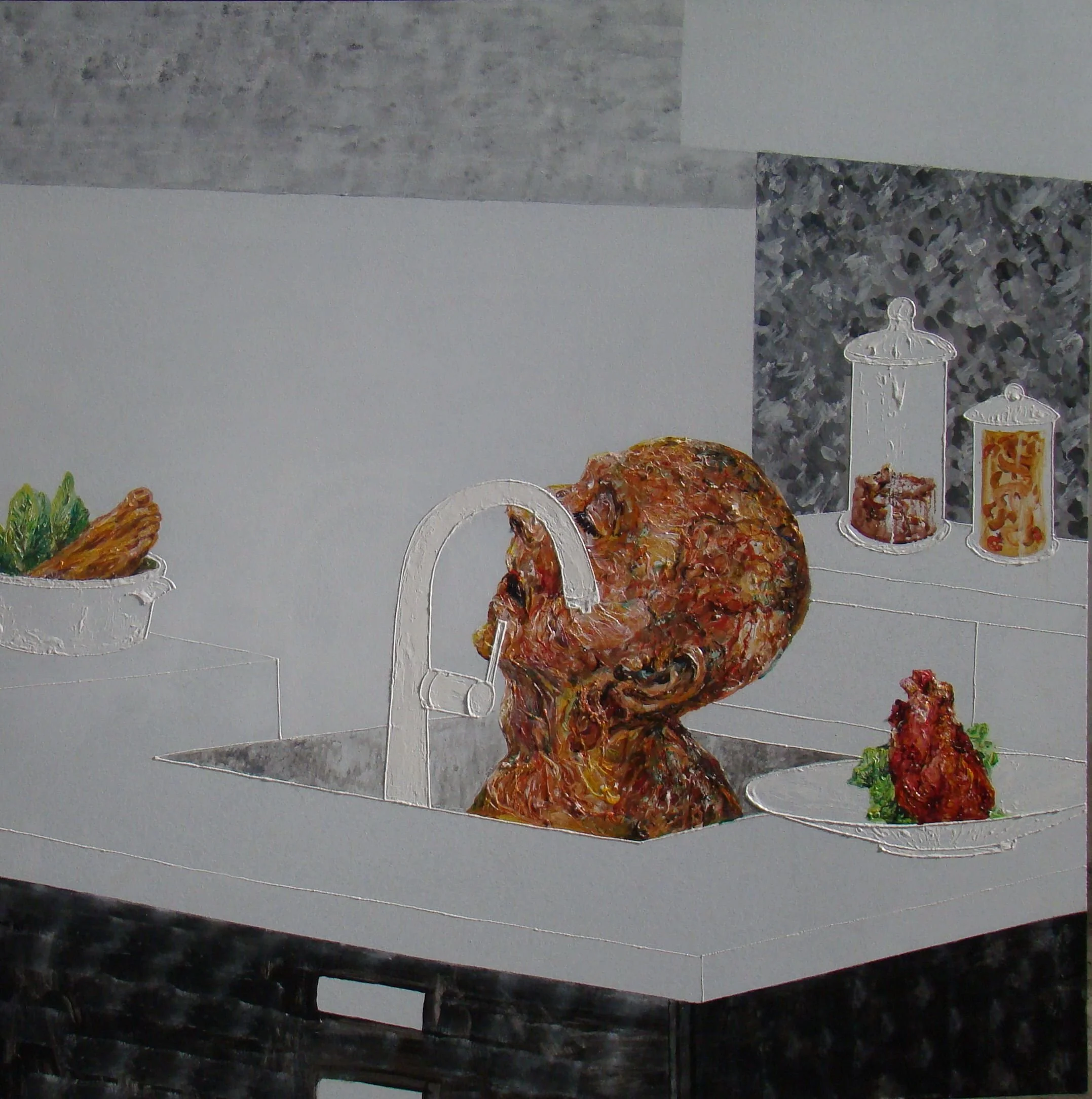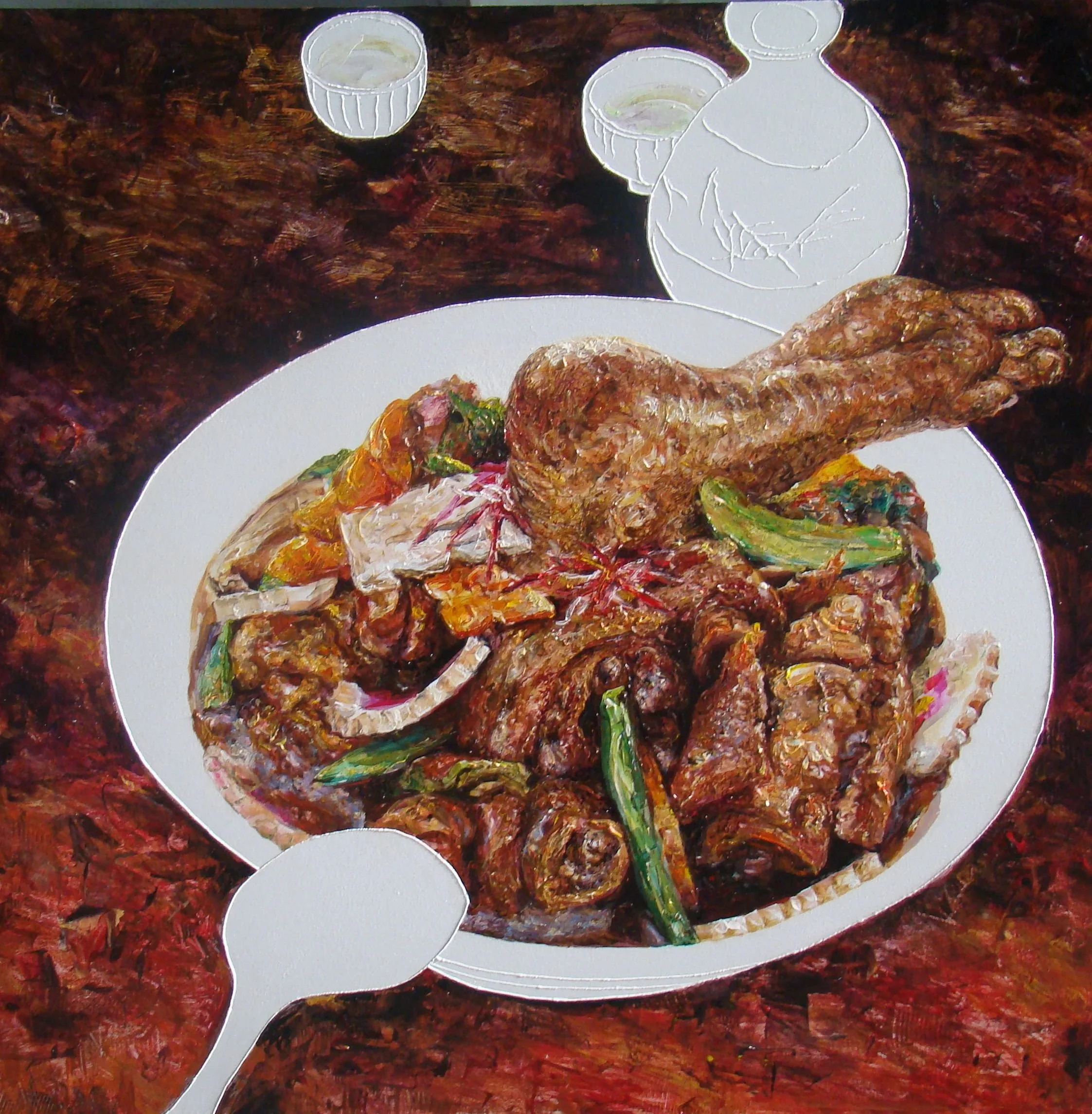 平時很習慣從自我身體涵蓋的範圍去看世界,自然地認為「我在此」、「雞在彼」;只要能入口的皆是身體的勢力範圍,如果我跟雞只是身體的不同,那當我把雞吃下肚,雞就變成了我,我豈不也變成了雞?喔!不!不!部分不等於整體,雞只是我身體的一部份,整體上來說,我還不會變成雞。雖然我及時說服自己內心的不安,卻發現要把自已跟外界劃一條清楚的界線,並沒想像中的容易。只要去看「我從哪裡開始?到哪裡結束?」就會困惑不已,讓刀叉筷子揮不下去。