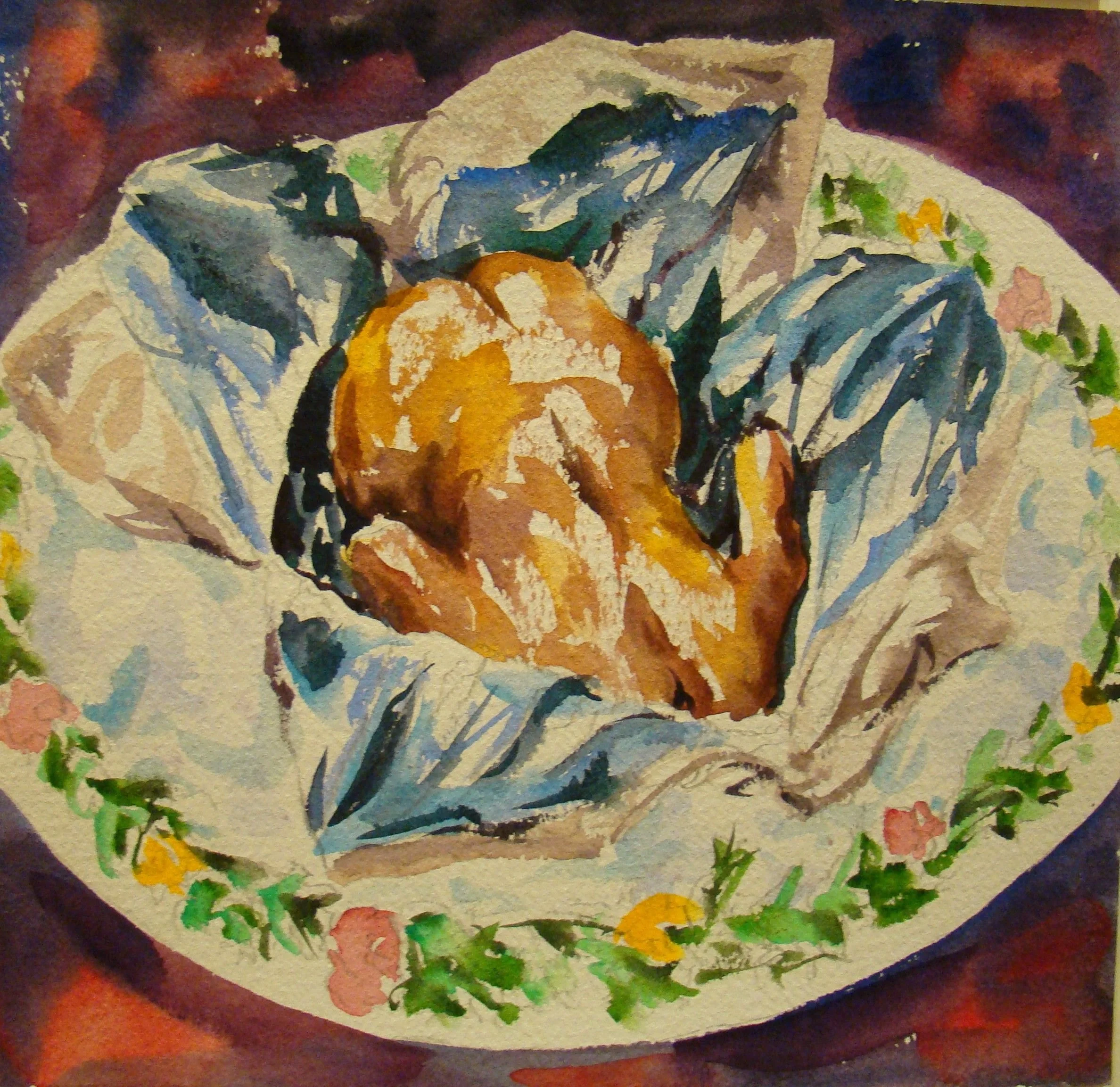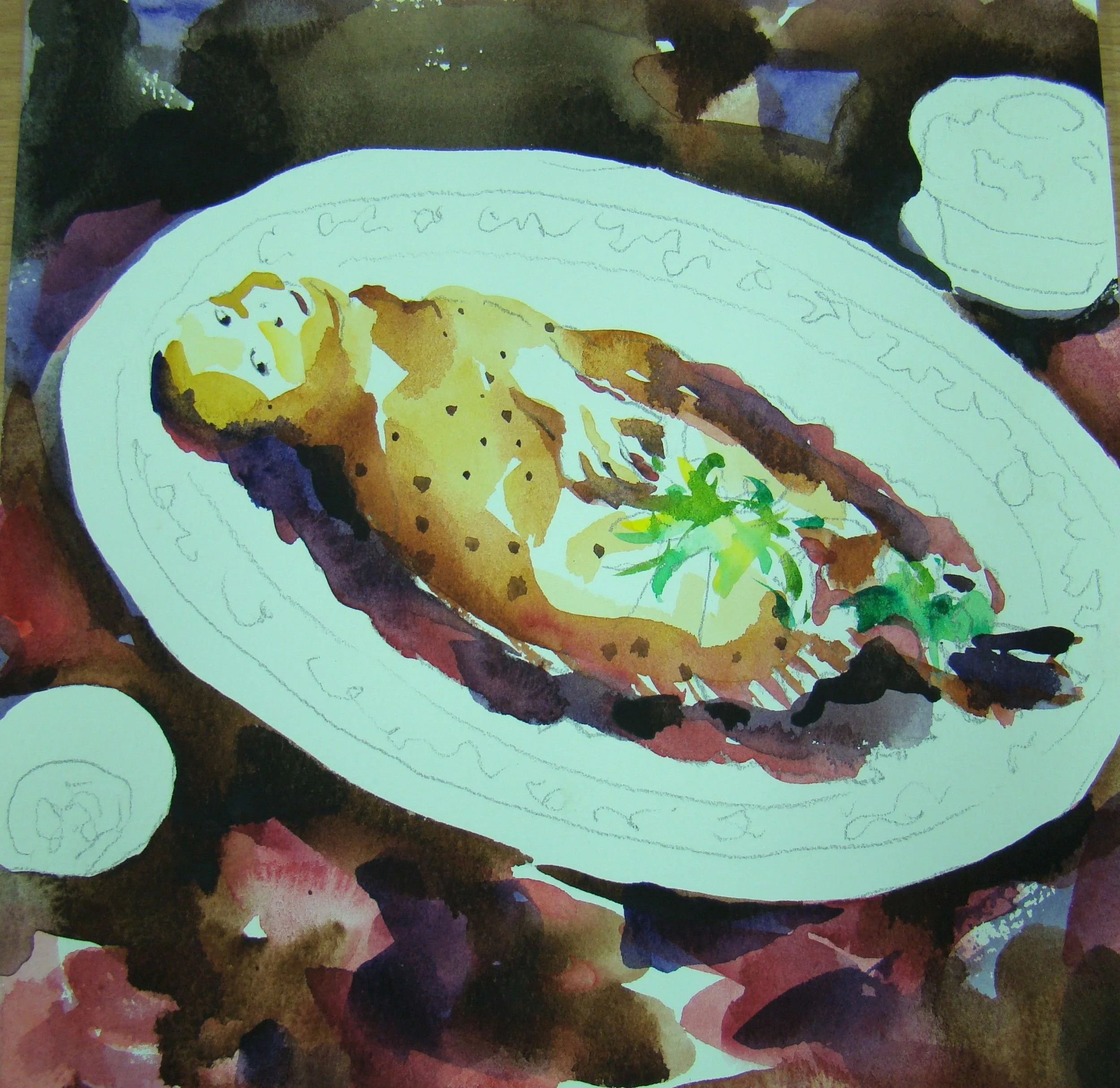 面對一隻香噴噴熱騰騰剛從窯口取出的黃金玉米雞,我除了緊閉雙唇暗嚥口水之外,實在說不出什麼話來。可是他身上為了燒烤勻稱而撐開身體的鐵棒,卻宛若小小的十字架,一齣活生生的受難曲自耳際揚起,我無法關閉腦中的影像,思緒自行漫遊而下。