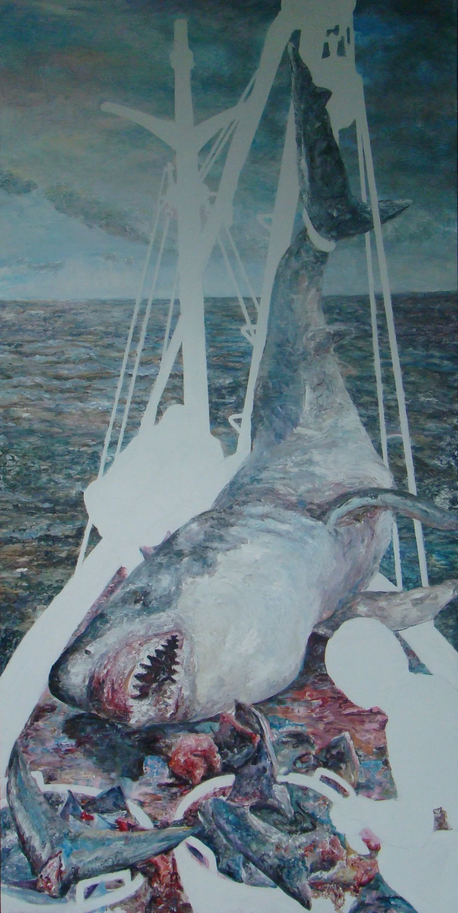 嗨! 我們大白鲨不知為何在人眼中成了狂魔,明明是人自己跑到海裏不小心才被咬,說得好像鯊魚跑到陸地去咬人一般,人支配弱者的生存處境除了侵佔他的生存空間之外,也將是非對錯的價值判斷強加其上。人吃鯊魚是天經地義,鯊魚吃人就是罪該萬死,就算人吃掉一百萬隻鯊魚的同時,鯊魚才吃掉一個人,鯊魚還是錯的,難怪人常抱怨「天理何在?」原來天理道德律法卻是最有能力施暴的人或是團體制定的。我們只能張大嘴哀嚎希望人為了自身的利益,為了永遠有魚翅吃,不要對我們趕盡殺絕。
