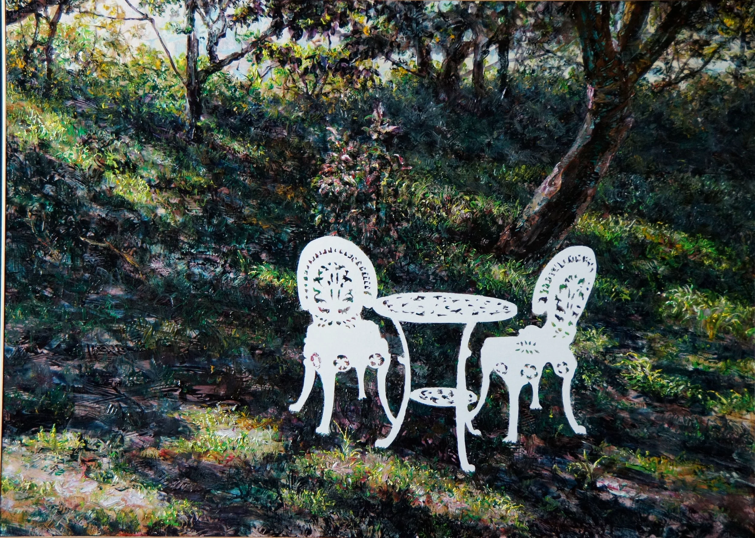 打從一開始就想畫一批很「俗」的畫,說得更精確些應說是很「媚俗」的作品。 什麼是「媚俗」呢? 對我而言, 那就像是結婚沙龍照, 明明本人長的很普通, 經由化妝、打扮、布景、柔焦鏡頭、電腦修片合成, 結果每個新娘都變成電影明星, 而當事人也樂於相信自己是那絕世美貌的公主, 只是平時不去張羅罷了! 這是個完美騙局, 騙人的受到推崇, 冠上大師美名; 而被騙者滿心歡喜。 美術最為人知的功能與目的就是充當行騙眼睛的工具。 把醜陋變漂亮、 平凡變稀有、 殘酷變夢幻...,成功的視覺作品總是幫我們把難堪的現實, 區隔出一方悠遊的天地。