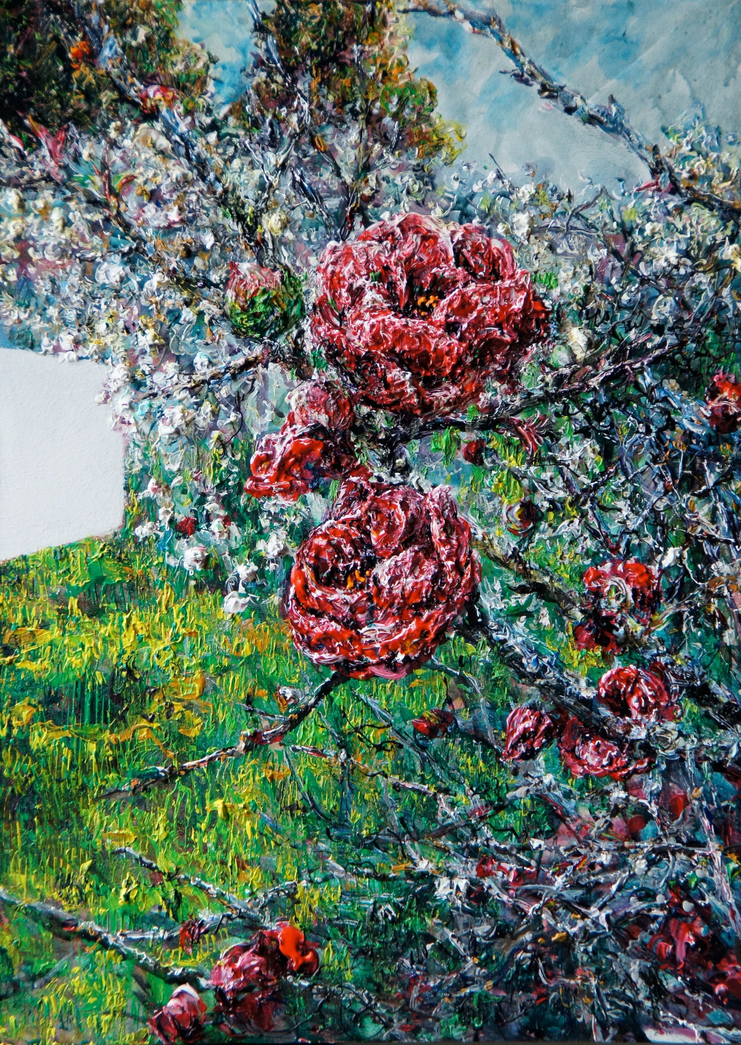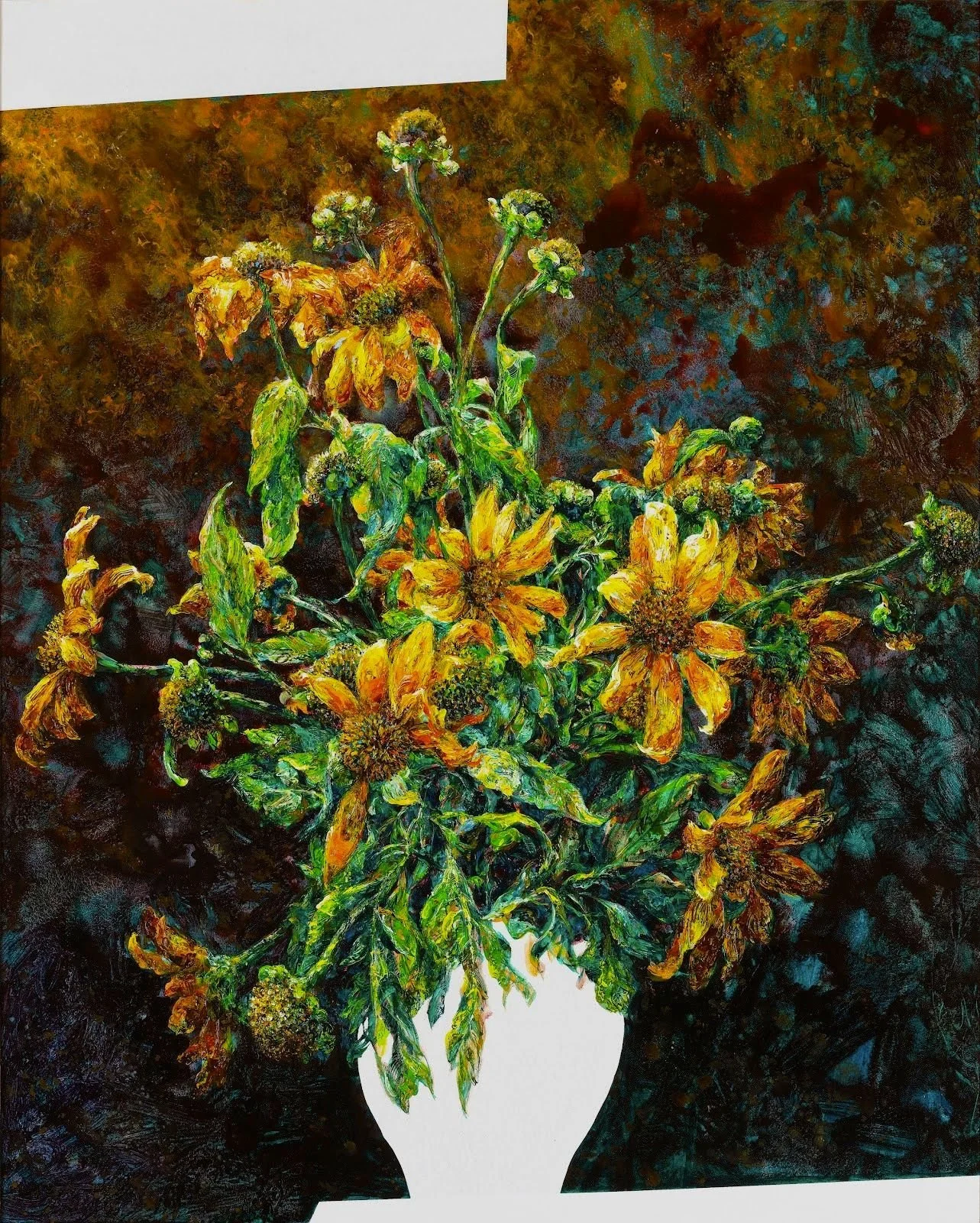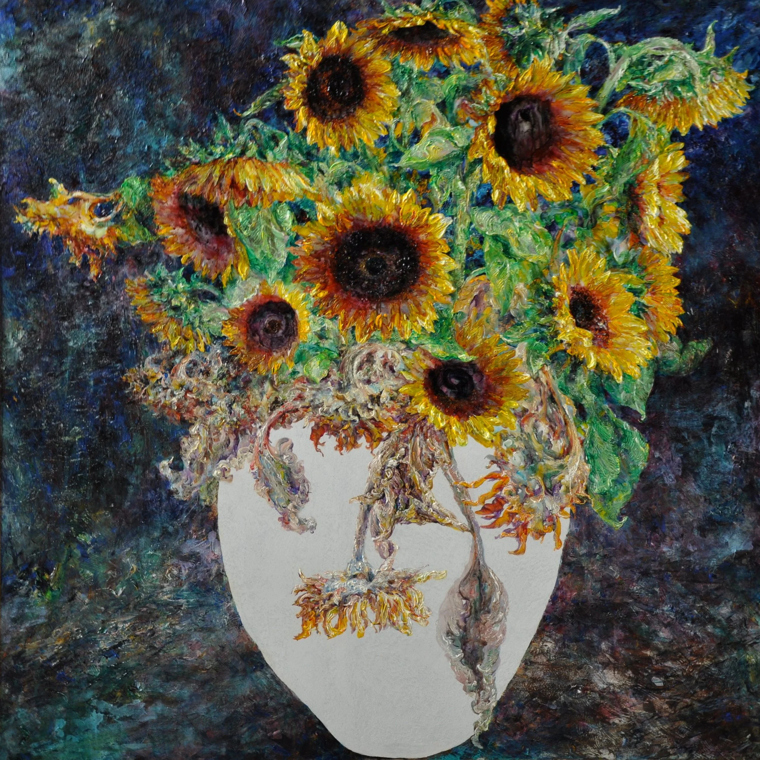 就拿「向日葵」來說吧, 任何一朵花, 只要你稍微看久一點, 它就會從含苞待放走到鮮花怒放, 然後是乾癟的像毛毛蟲的屍體。 不過一般人只會欣賞前兩段, 後半段大概早就丟進垃圾桶。 其實哪個生命不是盛極而衰, 逐漸步向死亡? 因而我把向日葵畫得有點陽萎, 就在它光華最盛的時刻, 其實預告著不可避免的結局。 至於「玫瑰花」在它鮮紅的花瓣底下, 我用對比的手法潛藏著憂傷藍綠色調。 作為愛情短命的象徵, 玫瑰其實再適切不過了! 你看著它三五天便知結果, 人呢? 三五年也知結果, 不是嗎?