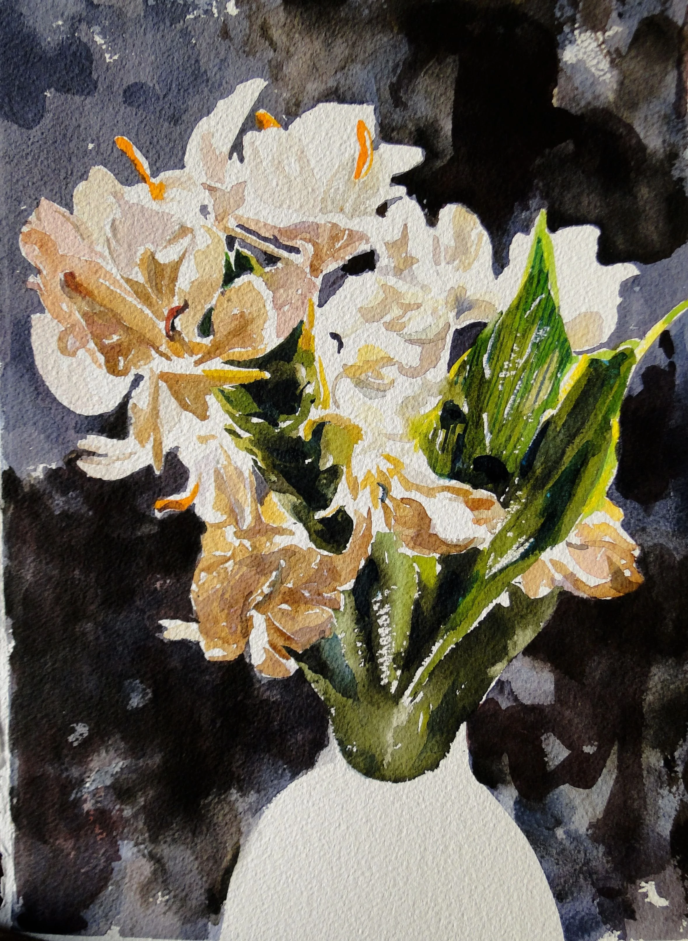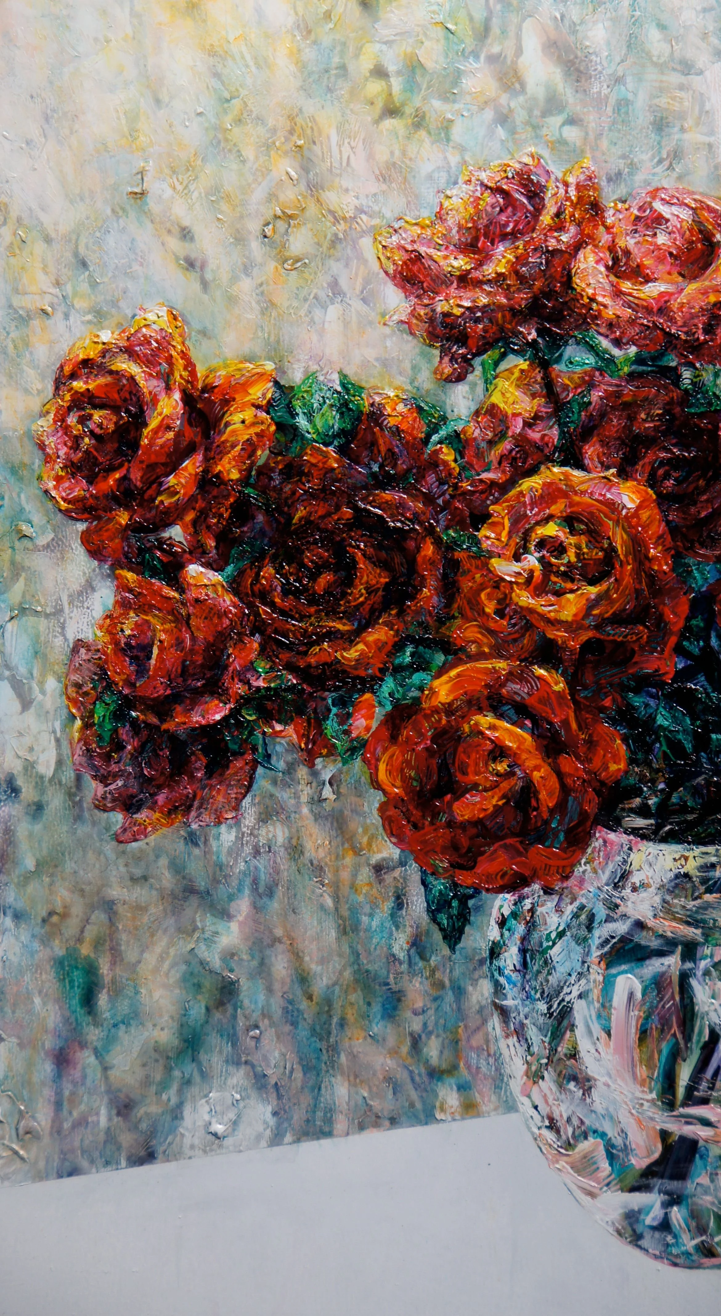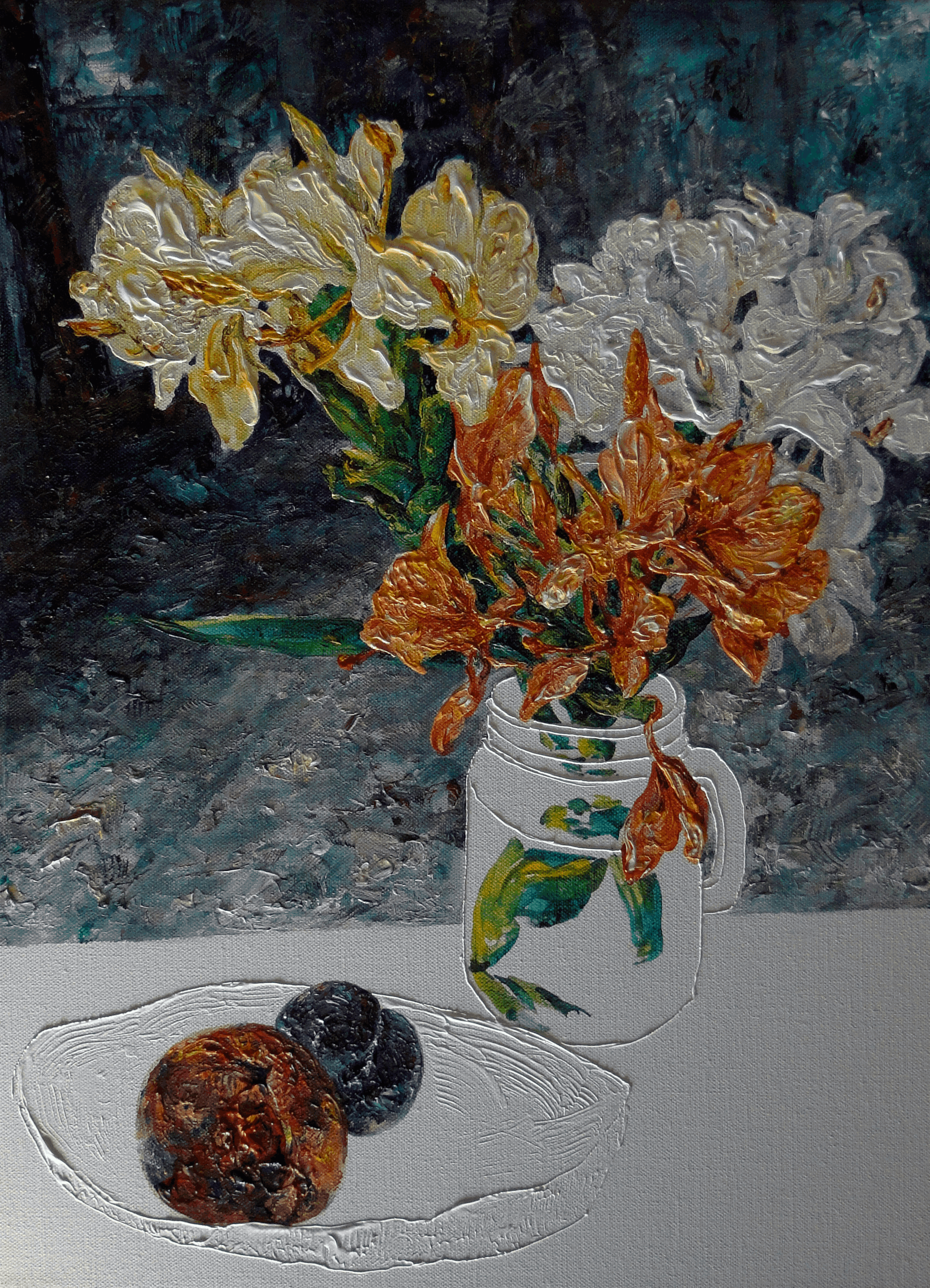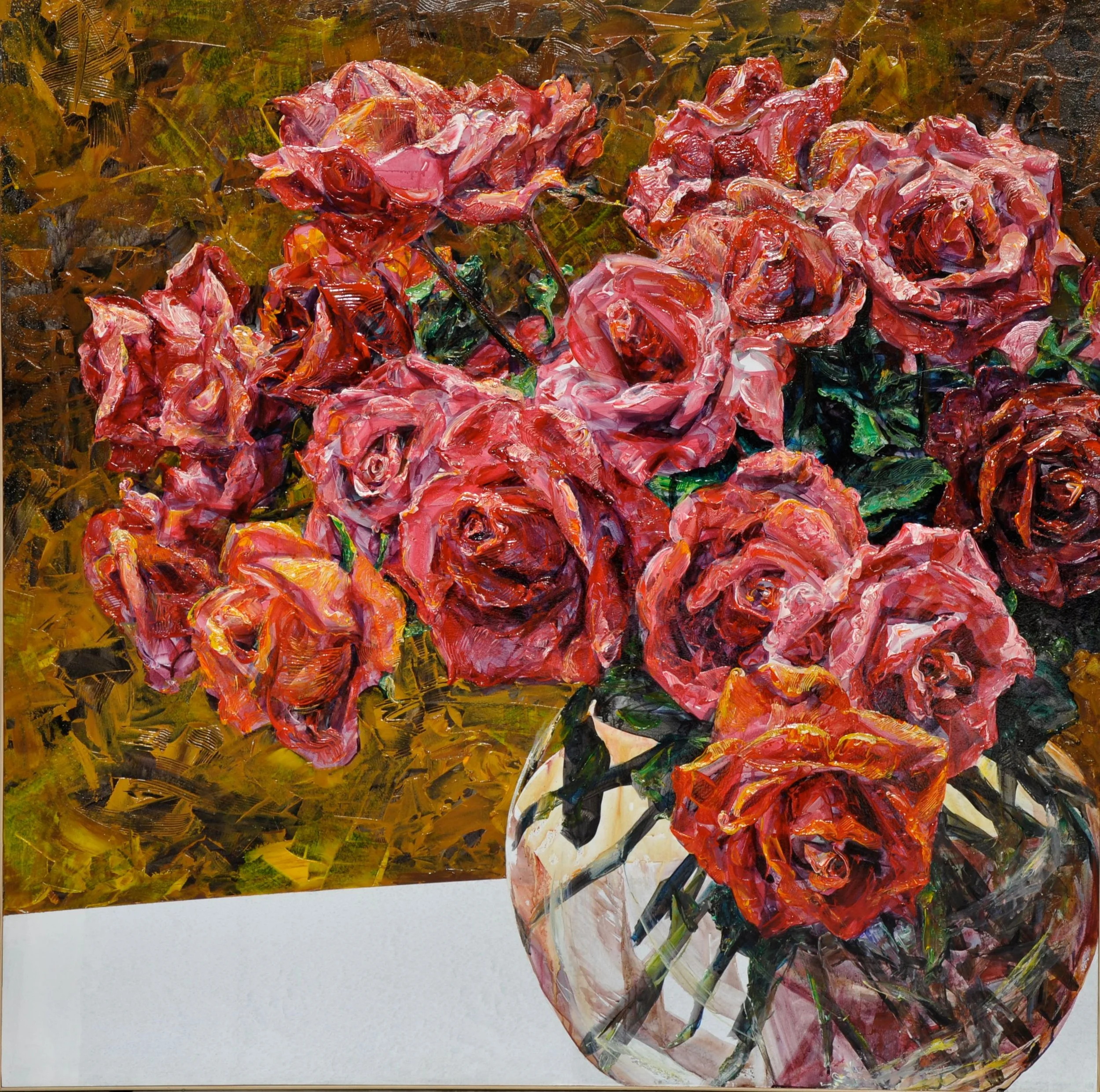 就拿「向日葵」來說吧, 任何一朵花, 只要你稍微看久一點, 它就會從含苞待放走到鮮花怒放, 然後是乾癟的像毛毛蟲的屍體。 不過一般人只會欣賞前兩段, 後半段大概早就丟進垃圾桶。 其實哪個生命不是盛極而衰, 逐漸步向死亡? 因而我把向日葵畫得有點陽萎, 就在它光華最盛的時刻, 其實預告著不可避免的結局。 至於「玫瑰花」在它鮮紅的花瓣底下, 我用對比的手法潛藏著憂傷藍綠色調。 作為愛情短命的象徵, 玫瑰其實再適切不過了! 你看著它三五天便知結果, 人呢? 三五年也知結果, 不是嗎?