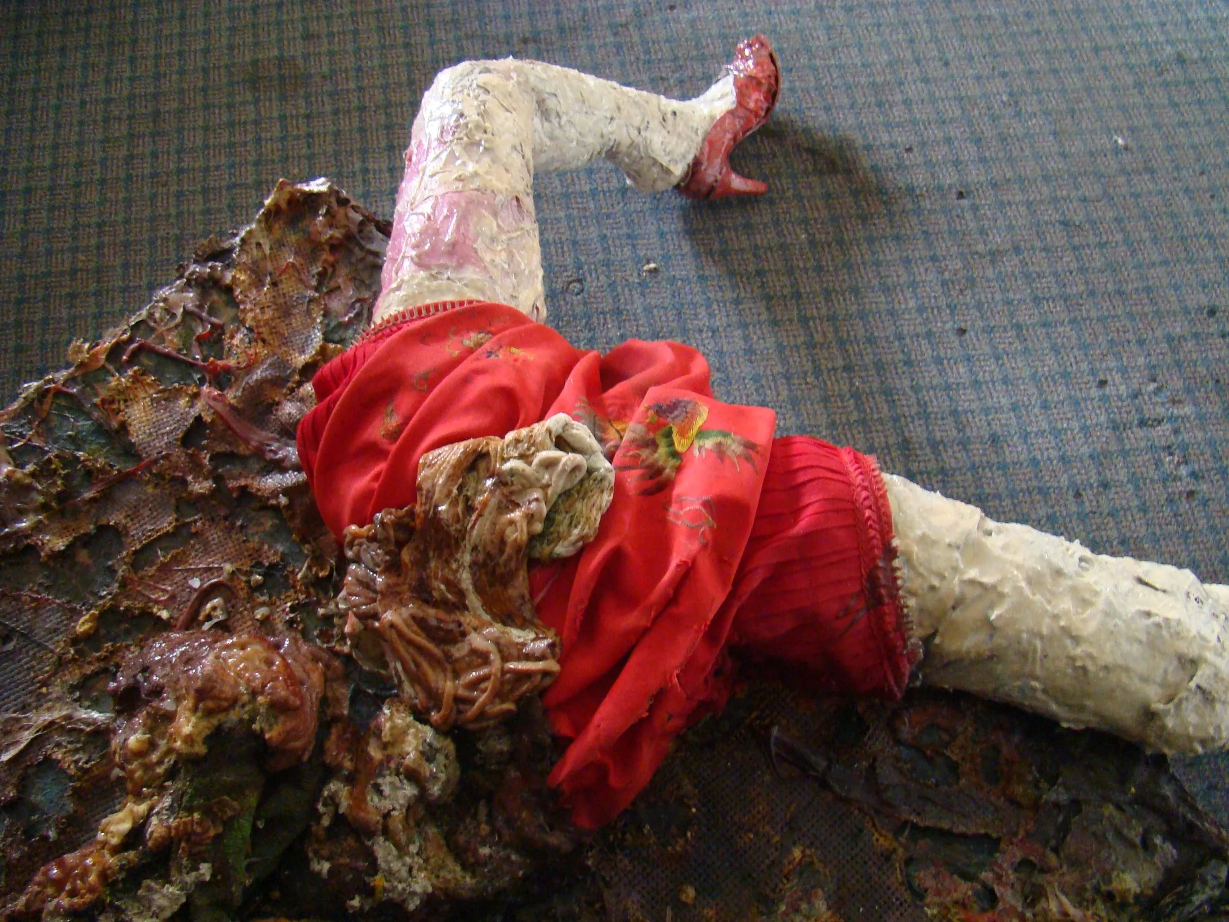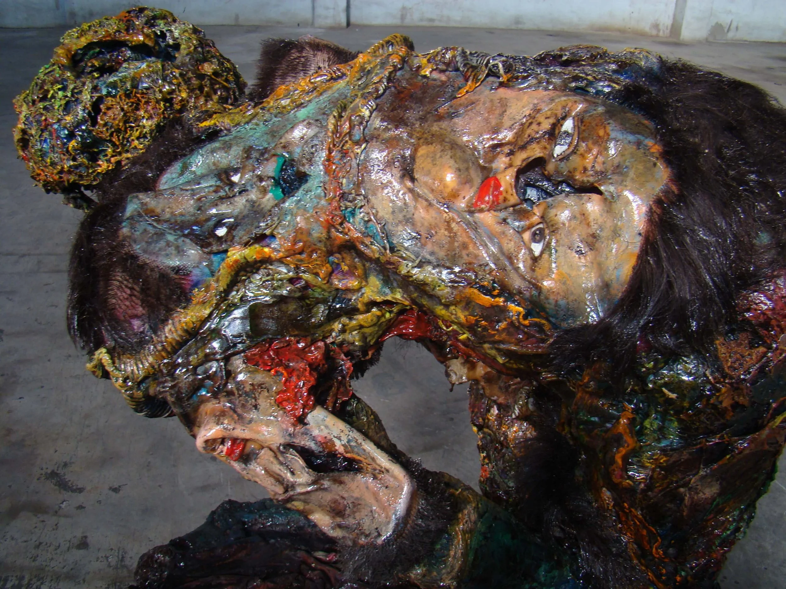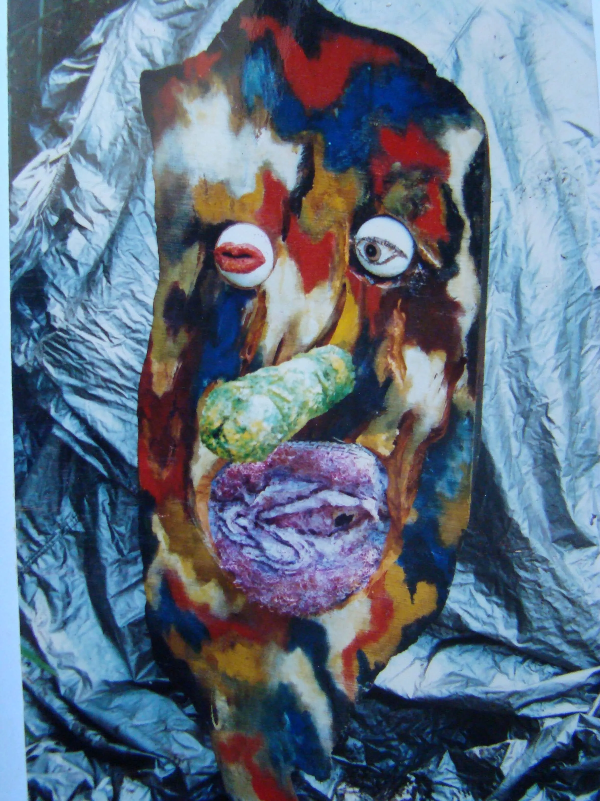 天有不測風雲,人呢,就更不用測了。35歲的我因為婚姻外遇被逮到,而弄得五馬分身、心力交瘁,在這熱鬧滾滾的同時我父親又被查出膀胱癌末期,我得單獨一人照顧父親,同時安撫兩個妒憤填膺外加歇斯底里的女人,並且一天教書八個小時。天啊!那段時間是怎麼走過來的?奇怪的是一天睡不到四個小時,還有時間創作。幸好有創作,我當時要是沒有藝術創作所帶來的自我療傷,恐怕只有燒炭一途。這件作品雖然名為愛滋病,但其實是記錄了個人對愛情生滅的恐懼,它’有個小小的副標題「讓我們一起、讓我們相愛、我們互相滲透、我們溶解、我們潰爛」