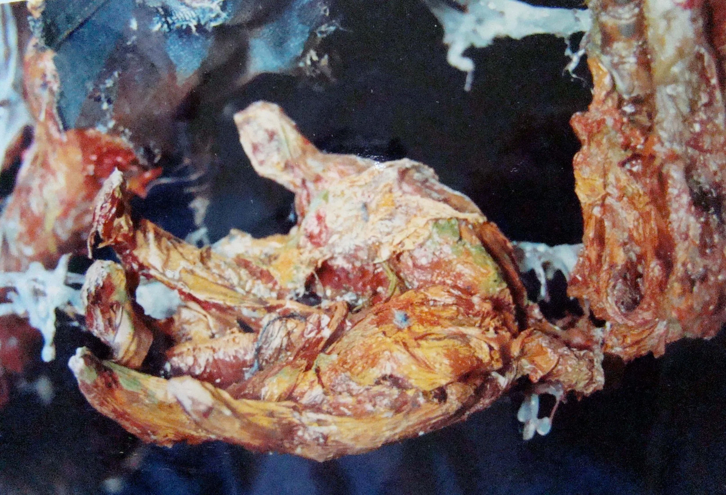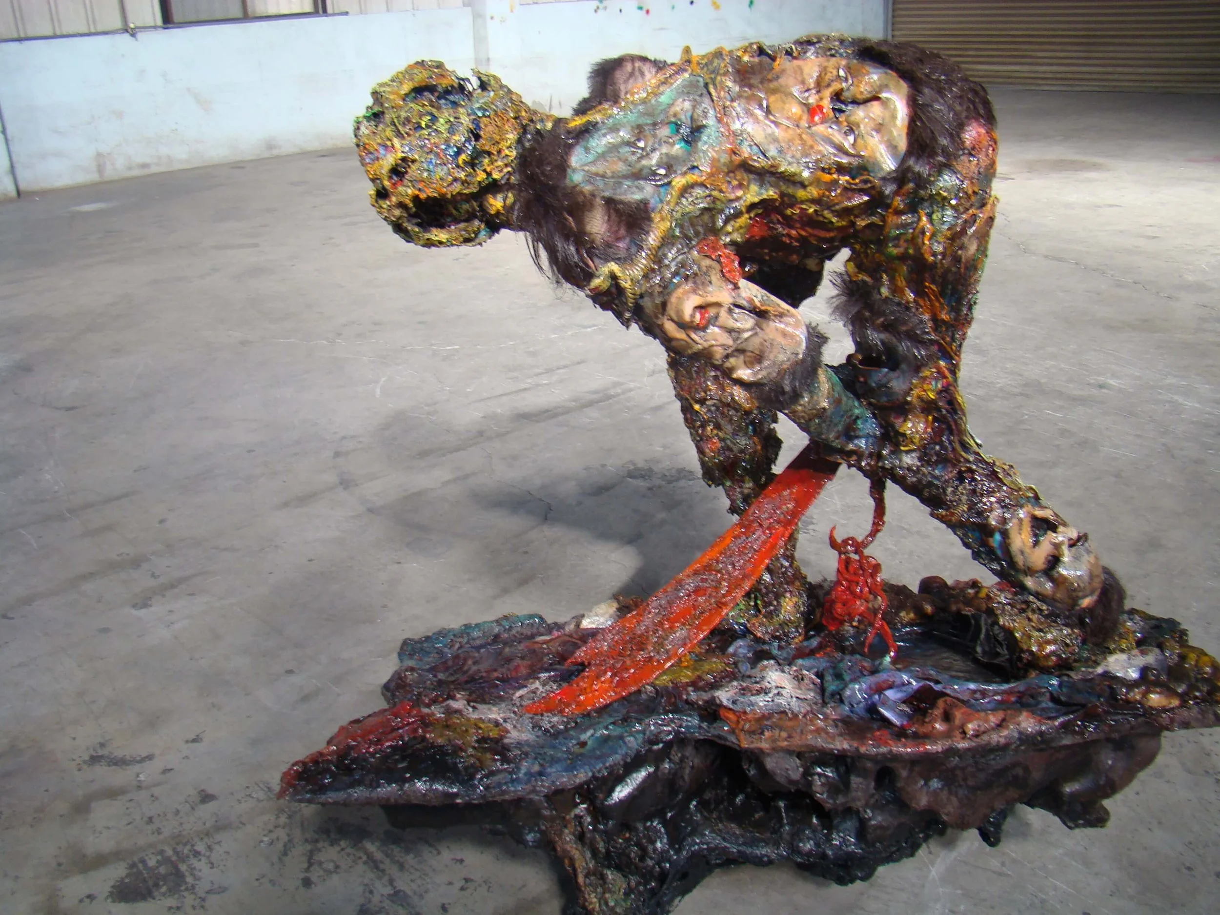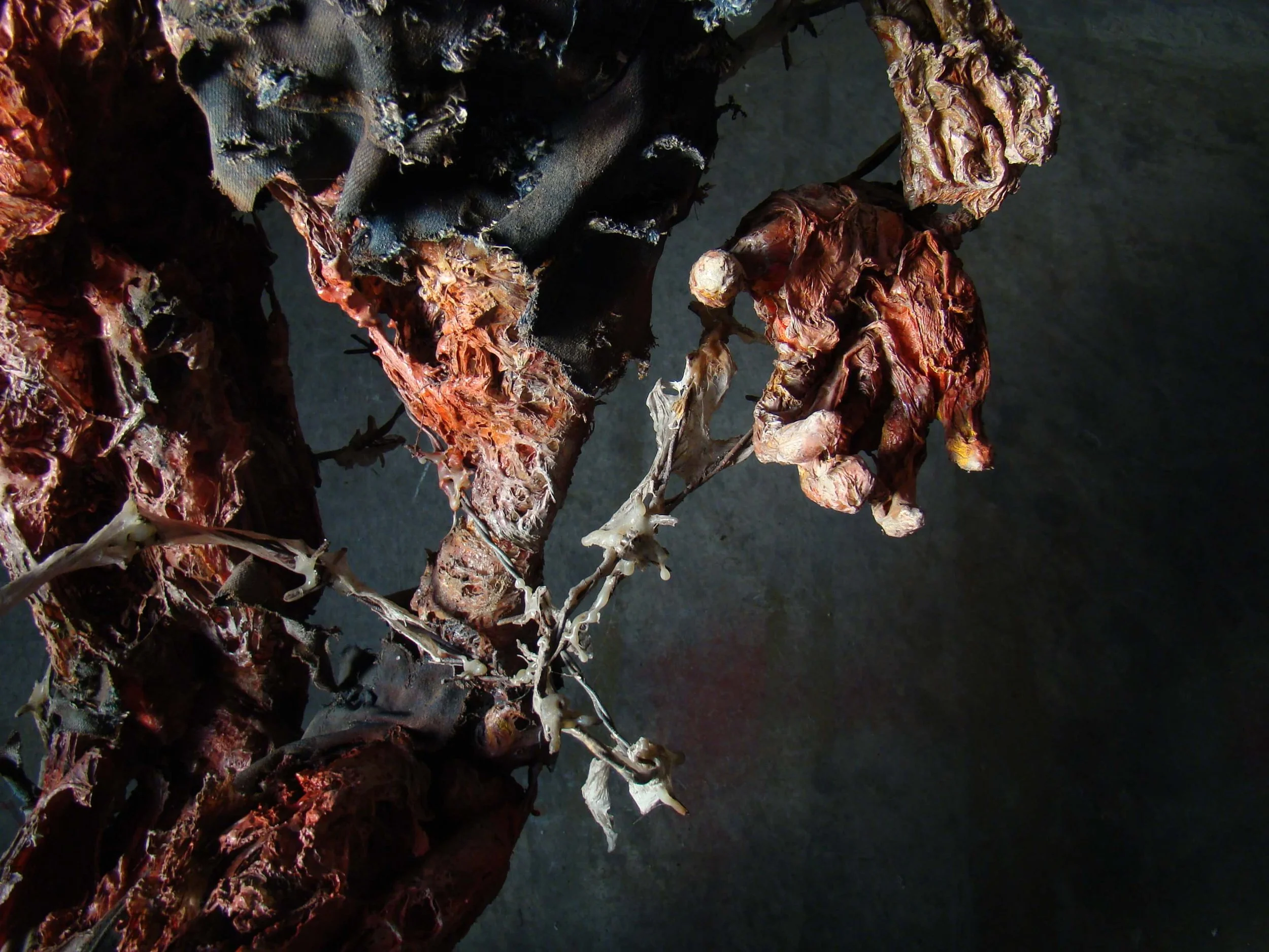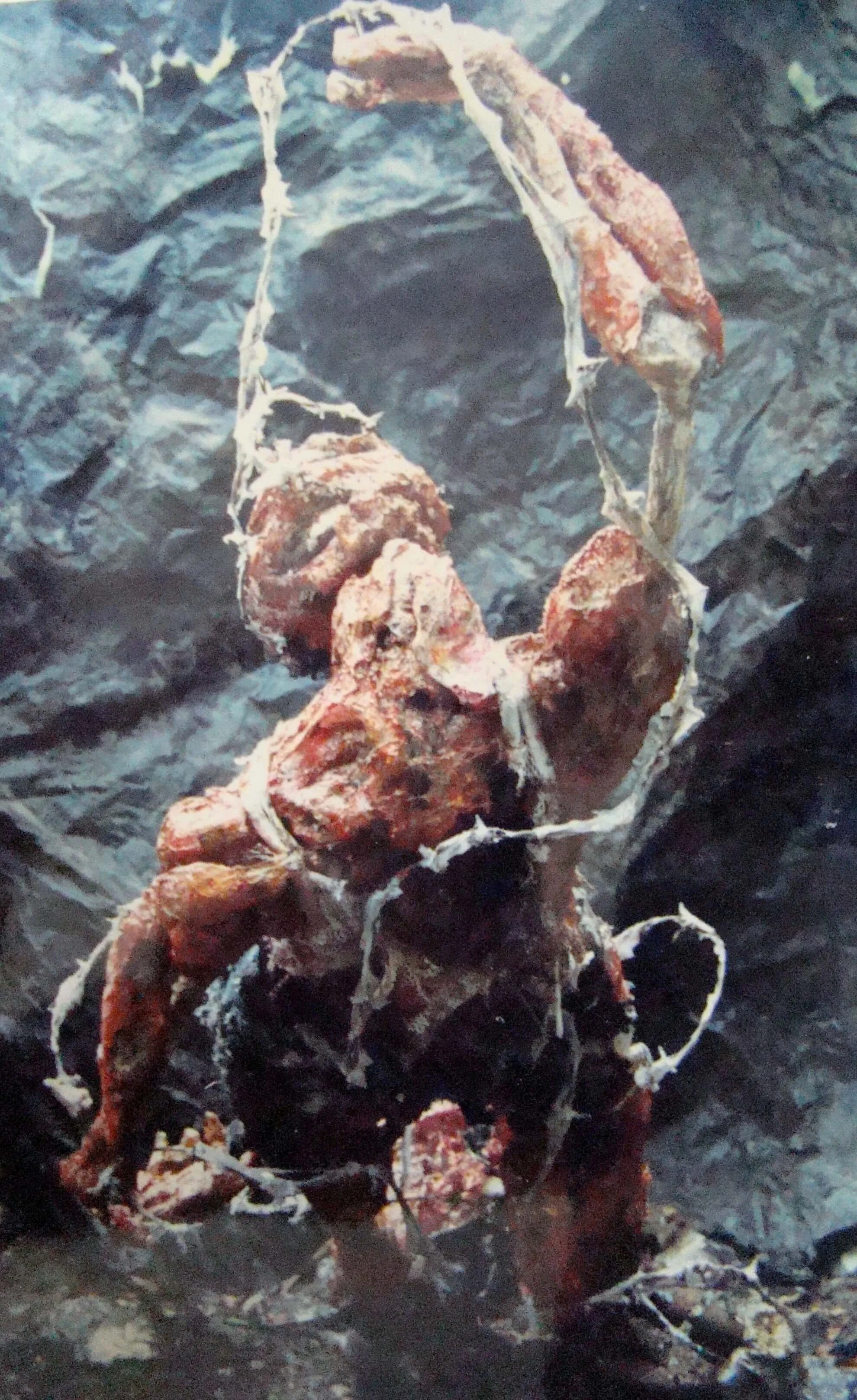 天有不測風雲,人呢,就更不用測了。35歲的我因為婚姻外遇被逮到,而弄得五馬分身、心力交瘁,在這熱鬧滾滾的同時我父親又被查出膀胱癌末期,我得單獨一人照顧父親,同時安撫兩個妒憤填膺外加歇斯底里的女人,並且一天教書八個小時。天啊!那段時間是怎麼走過來的?奇怪的是一天睡不到四個小時,還有時間創作。幸好有創作,我當時要是沒有藝術創作所帶來的自我療傷,恐怕只有燒炭一途。這件作品雖然名為愛滋病,但其實是記錄了個人對愛情生滅的恐懼,它’有個小小的副標題「讓我們一起、讓我們相愛、我們互相滲透、我們溶解、我們潰爛」